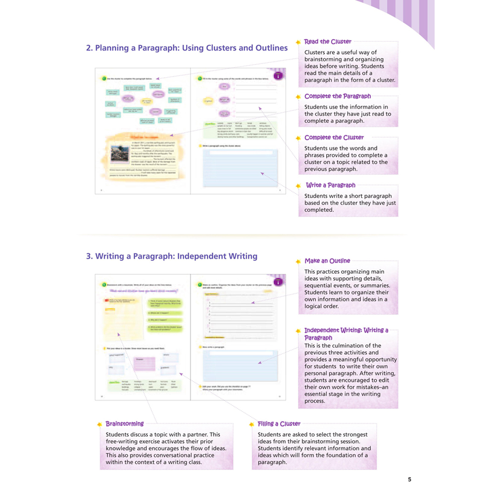 Book 2 著重於簡單段落,指導學生在大綱的輔助下進行段落寫作。