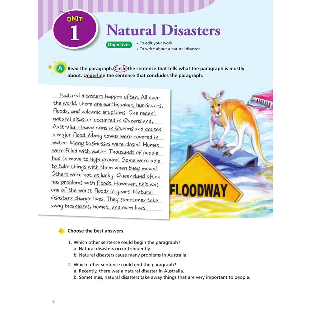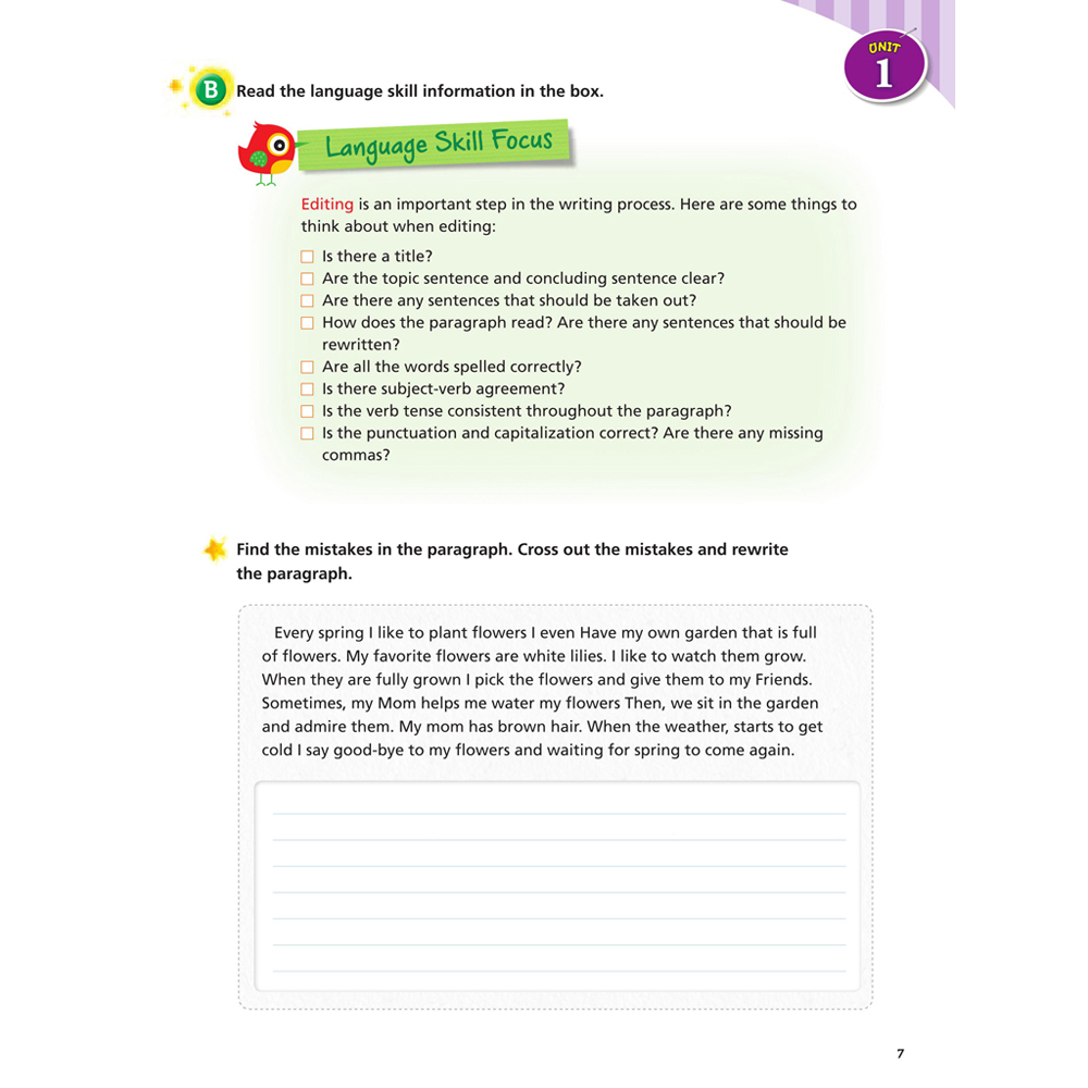 Book 1 著重於句子,指導學生依段落內容寫作句子並提示段落結構。