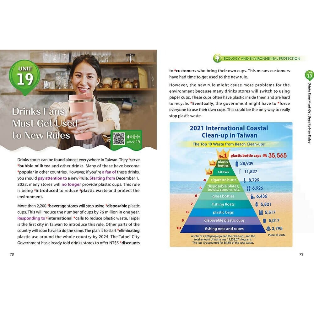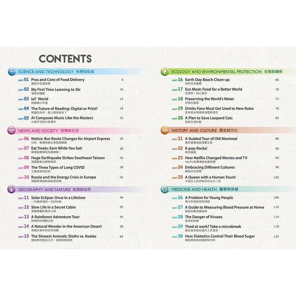 書中生活化體裁符合近年會考趨勢,以複合式文本形式結合文字、圖表、數據等生活情境訊息,有效培養解讀分析力。閱讀題目以素養導向方式命題,結合混合題型,加強統整應用能力。並增加整合題型,訓練思辨力,精準答題。單元末統整文章內的單字片語,提供延伸學習,一次掌握多元領域的核心詞彙。書後附錄的解析提供答題關鍵,強化解題技巧。