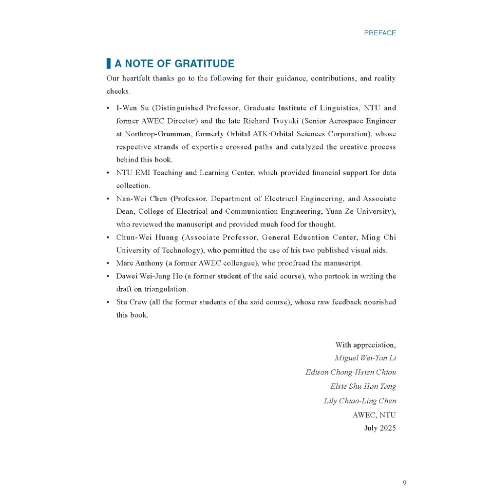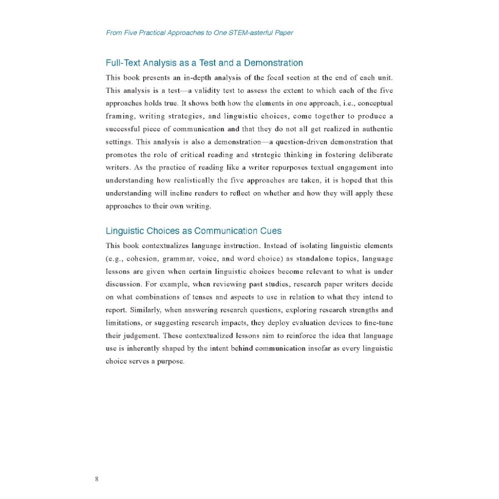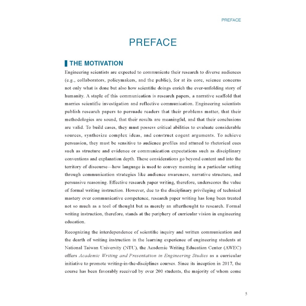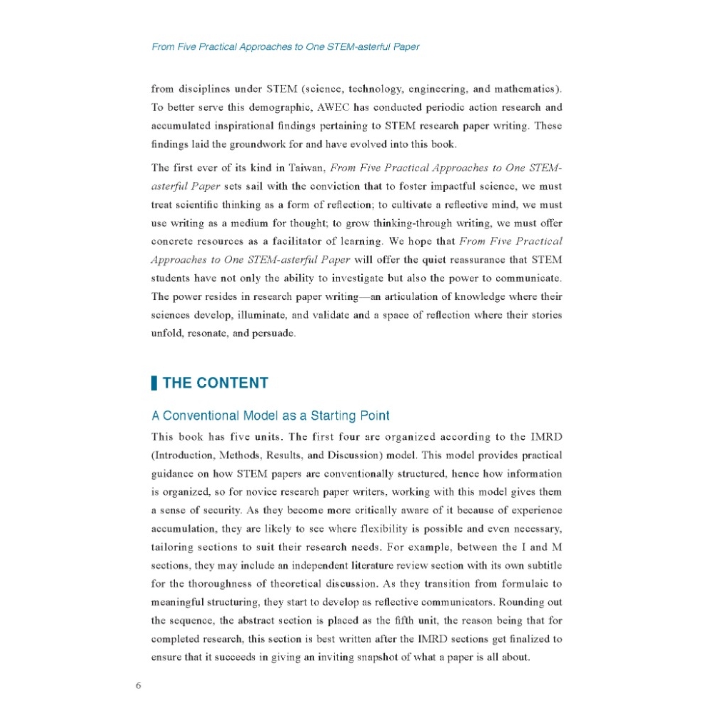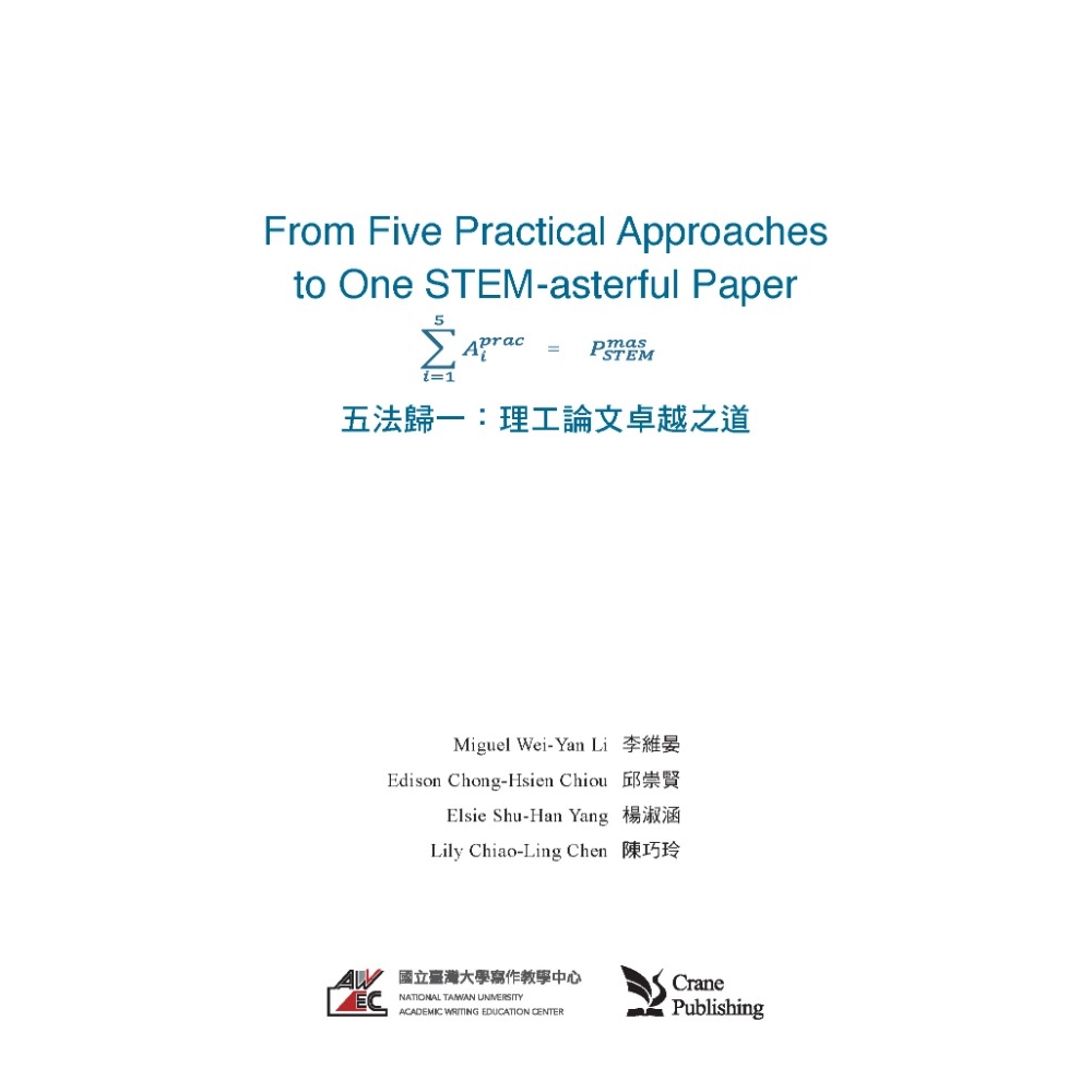 The first ever of its kind in Taiwan, From Five Practical Approaches to One STEM-asterful Paper is a proven resource for both STEM students striving to sharpen their writing skills and writing instructors seeking to strengthen their STEM-related instruction.