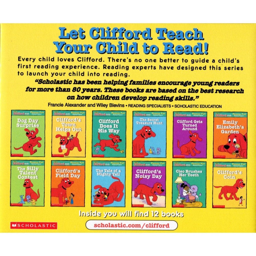 這套12冊的盒裝書講述了克利福德、朋友和家人的各種冒險經歷,這些經歷強化了克利福德關懷、分享和團結的價值觀。每本書都指出了重點學習的字母和發音,以及「要學習的單字」和「要發音的單字」。請留意盒裝書上摘錄的學樂閱讀專家的評語!
