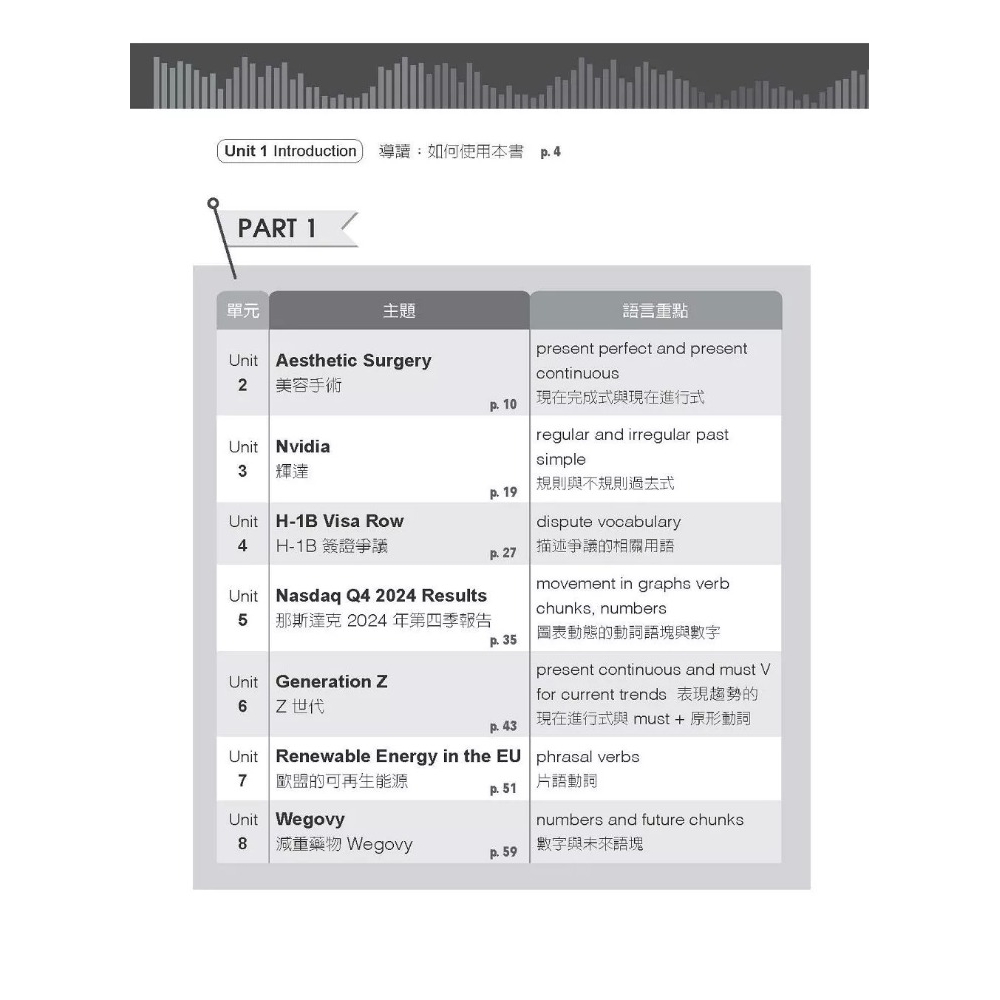 內容涵蓋科技、能源、醫療、旅遊、勞動政策……等全球產業議題,吸收新知的同時,也能有效掌握跨領域字彙,建立與專業人士對話的詞彙基礎,全面提升國際職場競爭力。