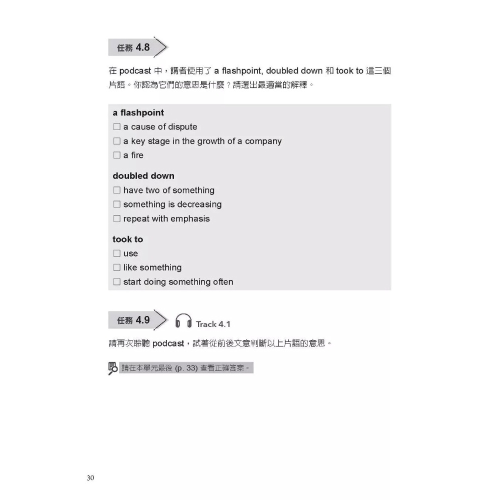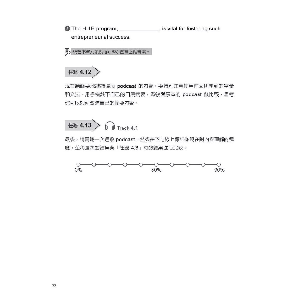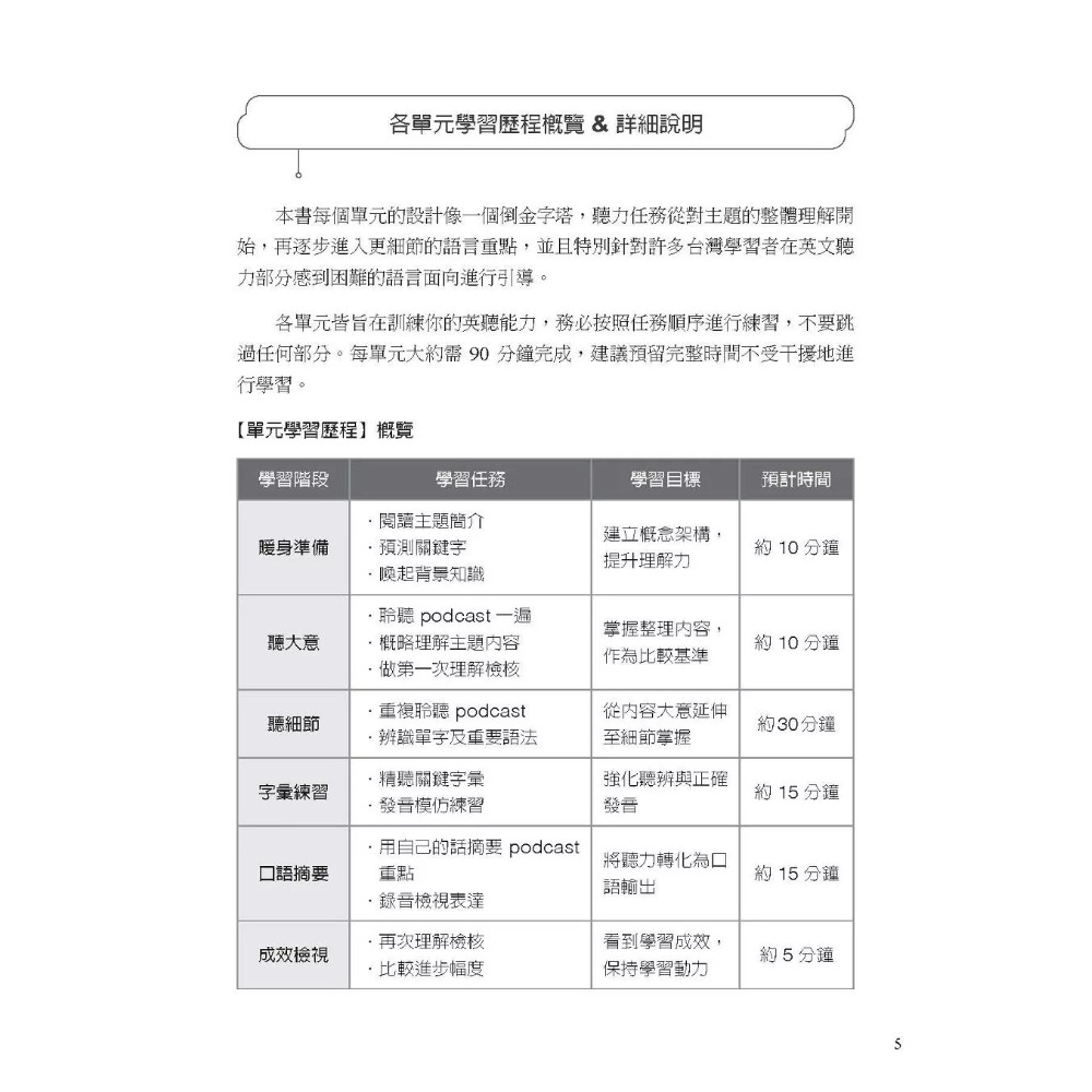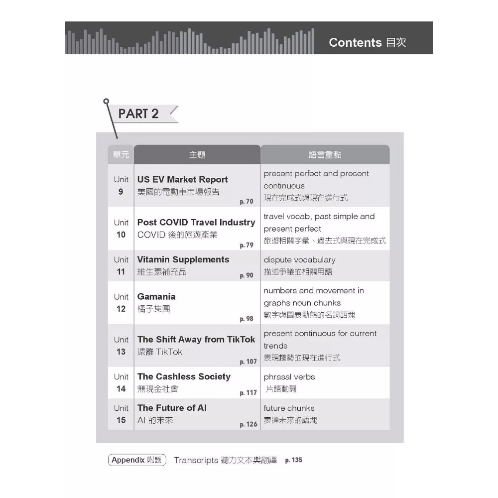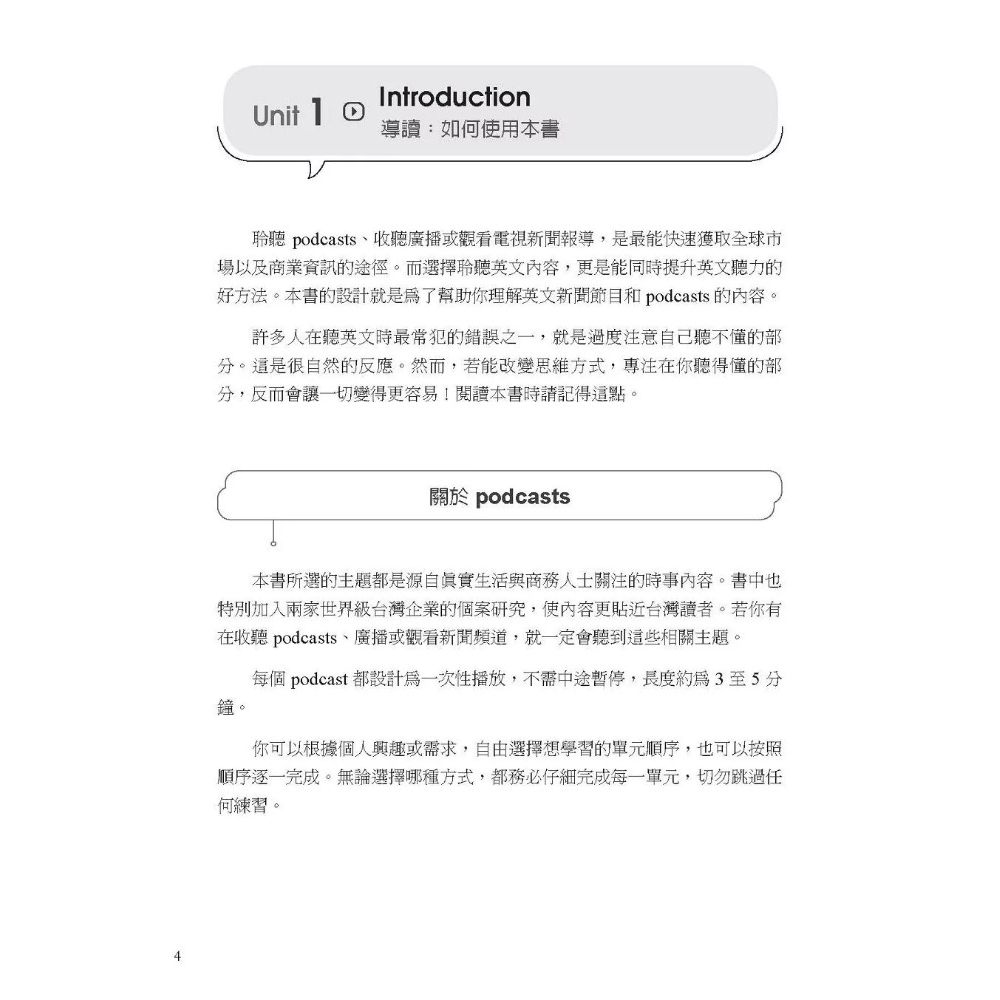 本書將國際產業相關 Podcast 內容精練成系統化教材,帶你透過「反覆聆聽 + 任務訓練」,逐步培養出真正能用的英語力。