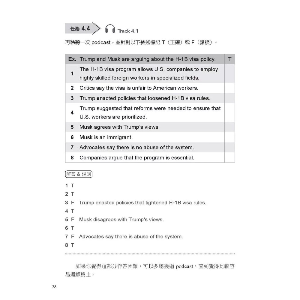 「泛聽大意 → 細聽關鍵字 → 文法應用 → 摘要口說」,不再停留在被動聆聽,而是透過輸出任務,把所學轉化成自信表達。每一次重聽,都是一次進步!