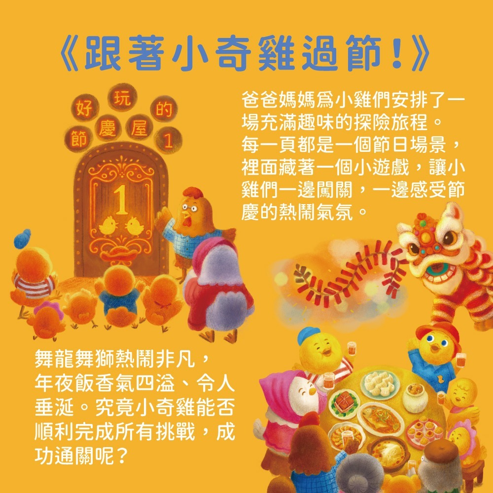 雞爸爸與雞媽媽為小雞們安排了一場充滿趣味的探險旅程。每一頁都是一個節日場景,並藏著一個小遊戲......