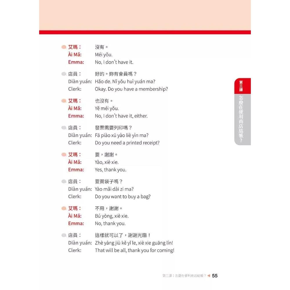 10 lessons with Hanyu Pinyin to help you with pronunciation. This book includes diverse and practical scenarios — introducing yourself, ordering drinks and food, asking for directions, taking the MRT, and learning Zhuyin. Follow along with the audio and start speaking right away!