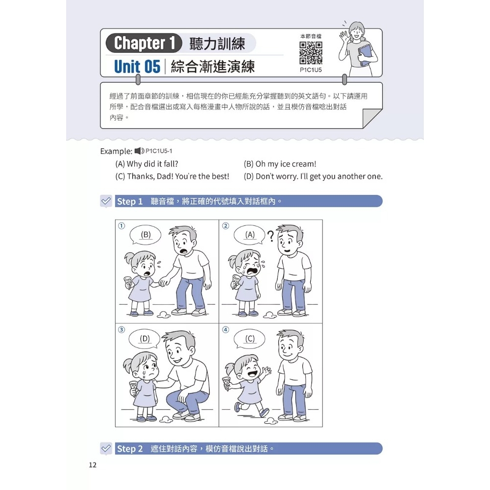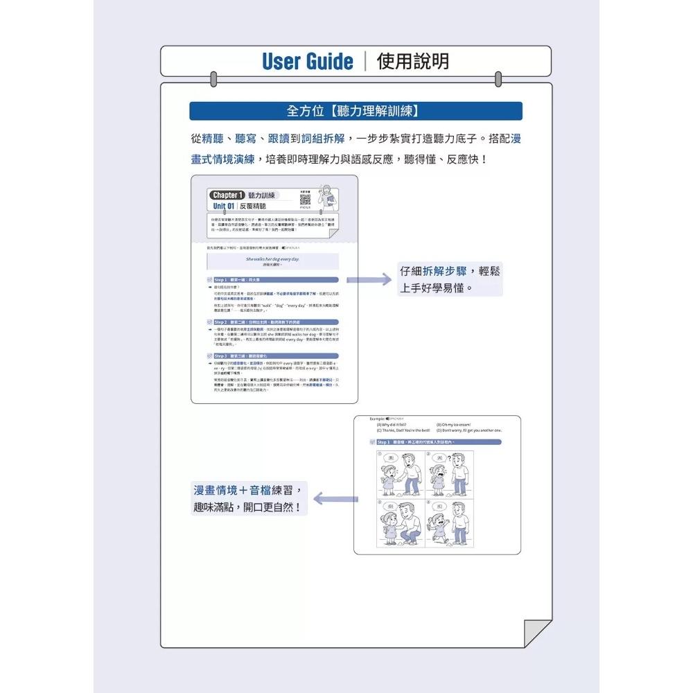 從精聽、聽寫、跟讀到詞組拆解,一步步紮實打造聽力底子。搭配漫畫式情境演練,培養即時理解力與語感反應,聽得懂、反應快!
