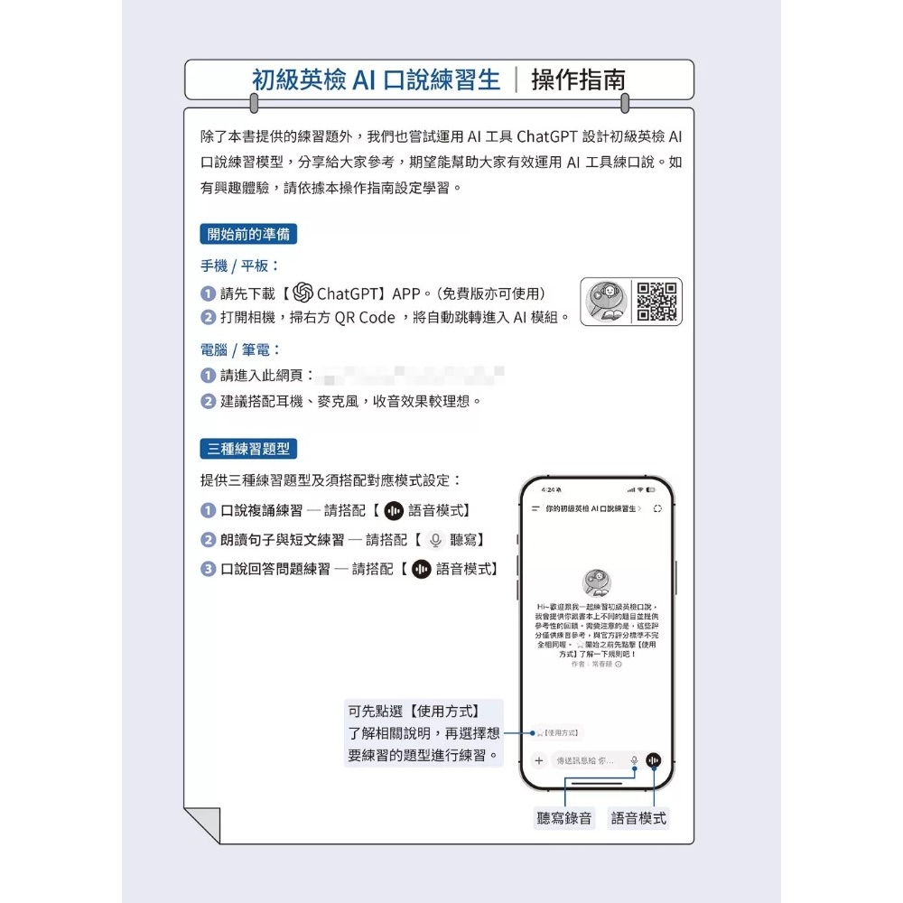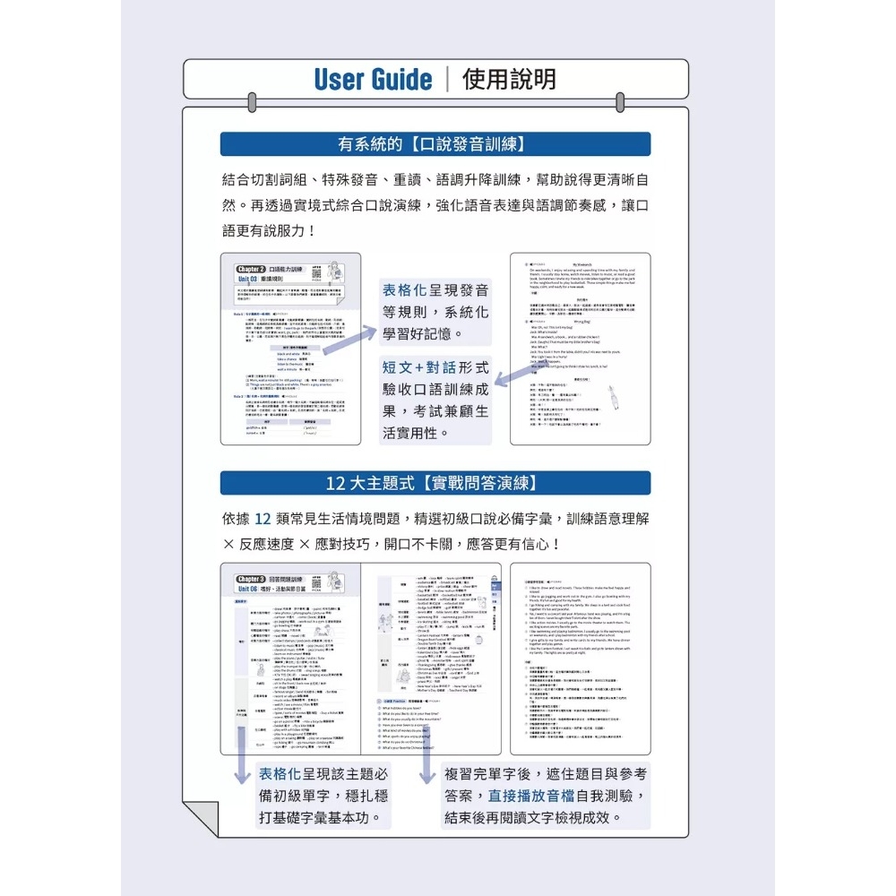 突破全民英檢初級口說瓶頸!針對GEPT新制全民英檢初級口說痛點,從聽懂題目到開口作答,一本搞定。全方位聽力訓練:精聽、聽寫、跟讀、詞組拆解,搭配漫畫情境,提升即時理解力。系統口說發音練習:切割詞組、特殊發音、重讀、語調,強化清晰自然表達。12大主題實戰問答:人物、飲食、健康、交通等,精選英檢必備詞彙,訓練反應速度與應對技巧。10回全真模擬試題,中英翻譯+單字補充,熟悉考場節奏。加碼提供免費AI口說練習生+線上音檔,口說練習高效升級!