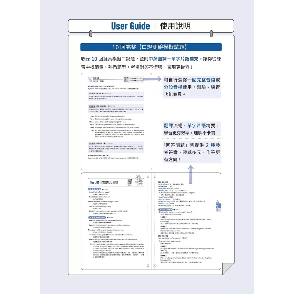 收錄10回「全真」模擬口說題,並附中英翻譯+單字片語補充。讓你從練習中找節奏,熟悉題型,考場對答不慌張、表現更從容!