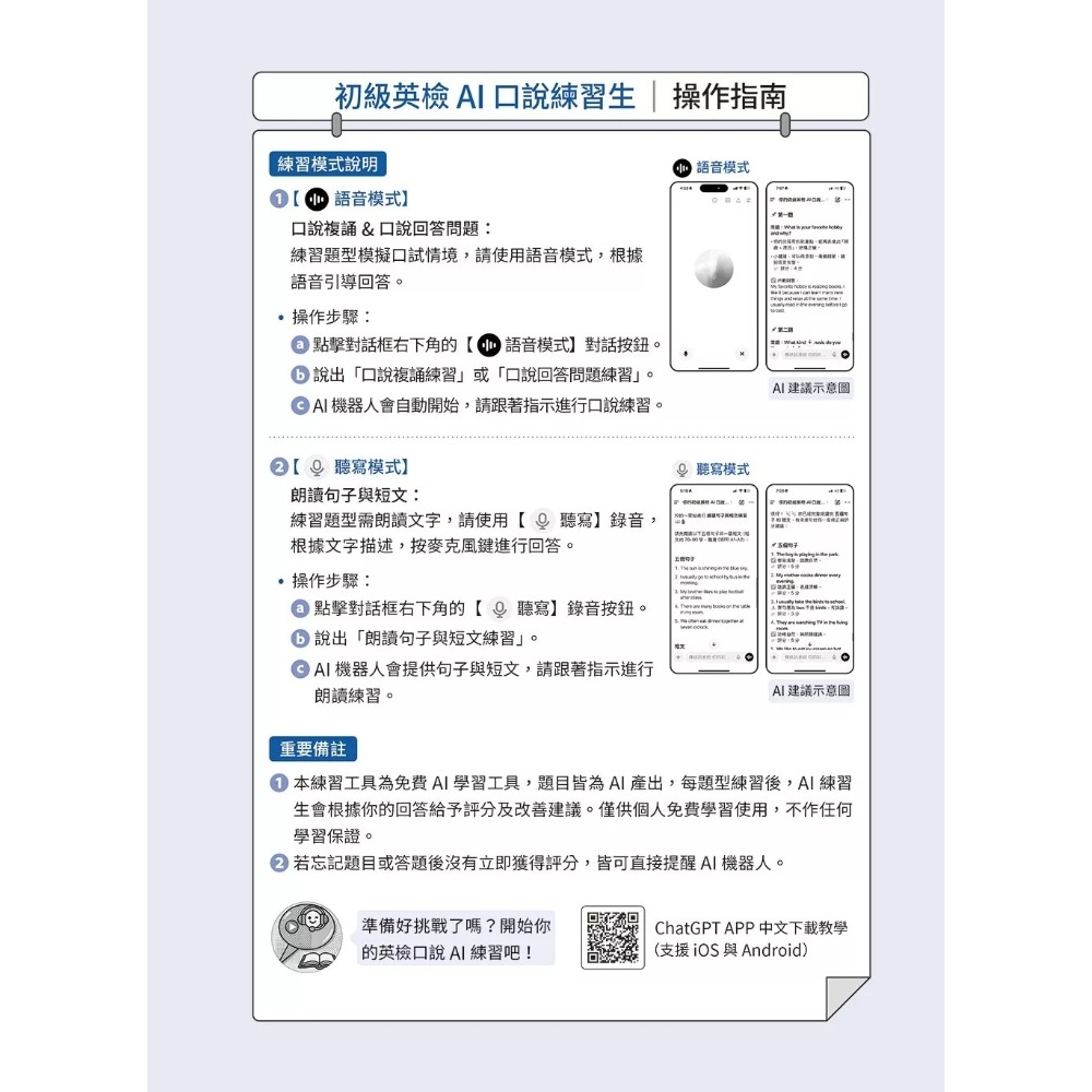 1. 免費AI口說練習生:掃QR Code,使用AI評分你的發音、流暢度與內容,強化應考自信。(僅供練習參考,實際考試評分以主辦單位公告標準為準。)