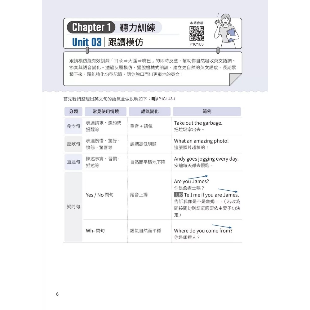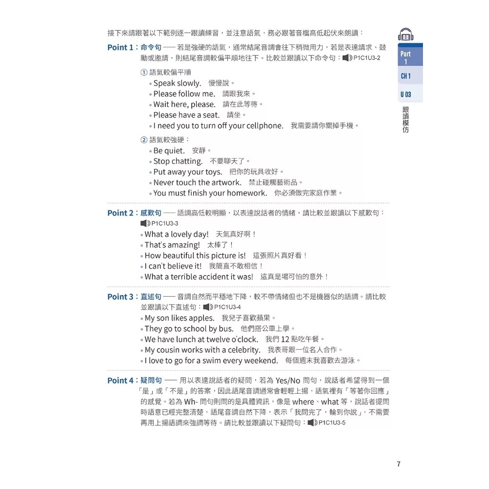 2. 口語能力訓練(Chapter 2):針對發音不準的問題,從「理解文字 & 切割詞組」入手,教標記重音及連音、特殊發音規則、加入情緒、錄音比對改進。讓你的口說更清晰、自然、有節奏感,避免考官聽不懂。