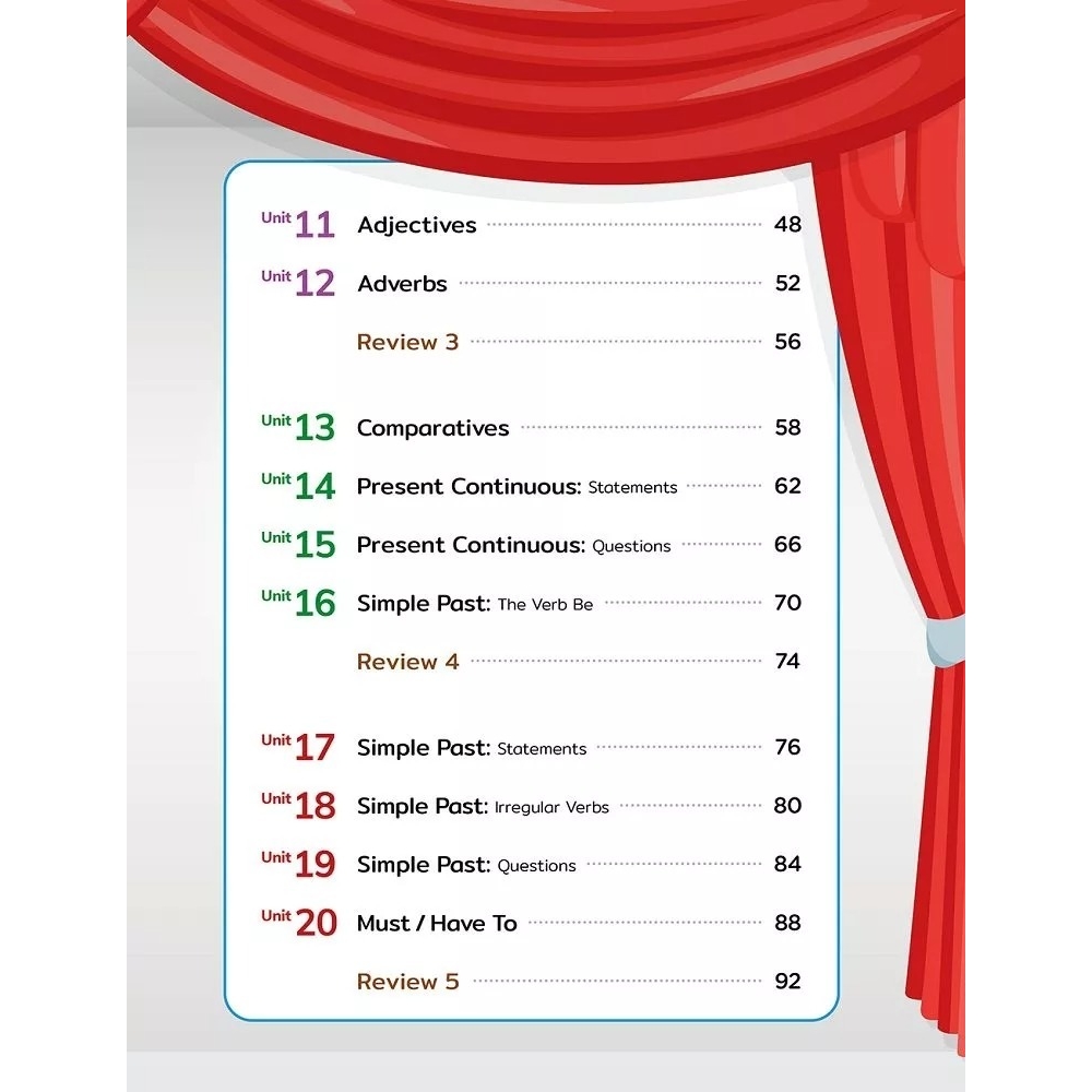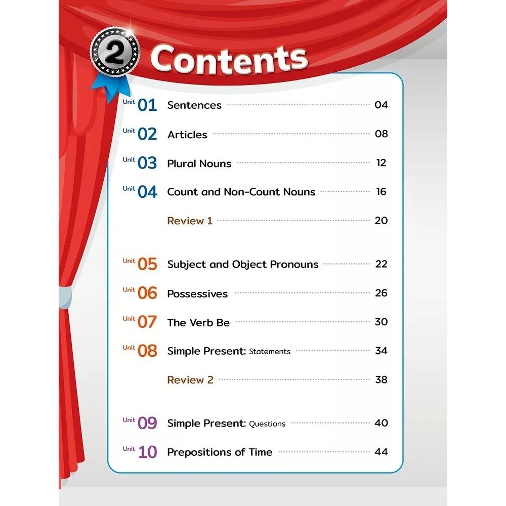 本系列套書共三冊,此為第二冊。每冊皆含學生本 (Student Book) 及練習本 (Workbook),著重於「由點到線、由線成面」的漸進式教學。每冊包含 20 個文法單元與 5 個複習單元,從單字延伸到句子、對話,再到段落與生活化寫作,讓文法學習不只是「記憶」,更是「應用」。教材內容安排上,學習主題與字彙難度都以螺旋式編排,不斷重複、深化與擴展,幫助學生建立語言邏輯與英文思維。