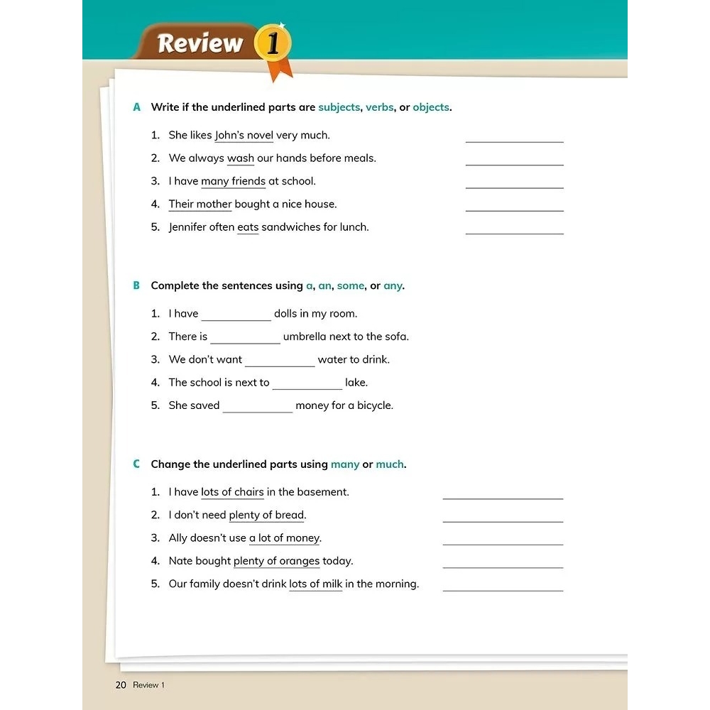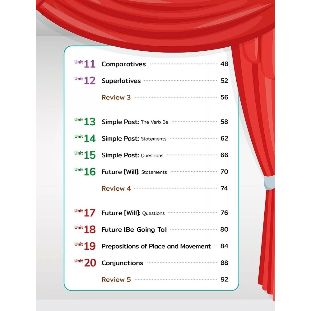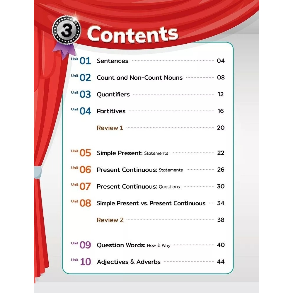 本系列套書共三冊,此為第三冊。每冊皆含學生本 (Student Book) 及練習本 (Workbook),著重於「由點到線、由線成面」的漸進式教學。每冊包含 20 個文法單元與 5 個複習單元,從單字延伸到句子、對話,再到段落與生活化寫作,讓文法學習不只是「記憶」,更是「應用」。教材內容安排上,學習主題與字彙難度都以螺旋式編排,不斷重複、深化與擴展,幫助學生建立語言邏輯與英文思維。