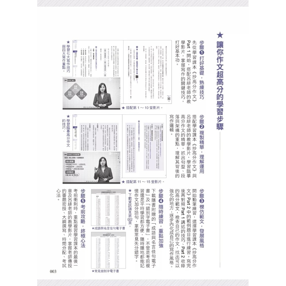 考前衝刺時,重點複習學習課本《抄高分作文》的最後一章及呂緋老師的教學影片,掌握老師傳授的審題密技、大綱撰寫、時間分配、考試心法。上場前就不怕緊張崩潰,而是像吃了顆定心丸,能冷靜、精準、穩定發揮!
