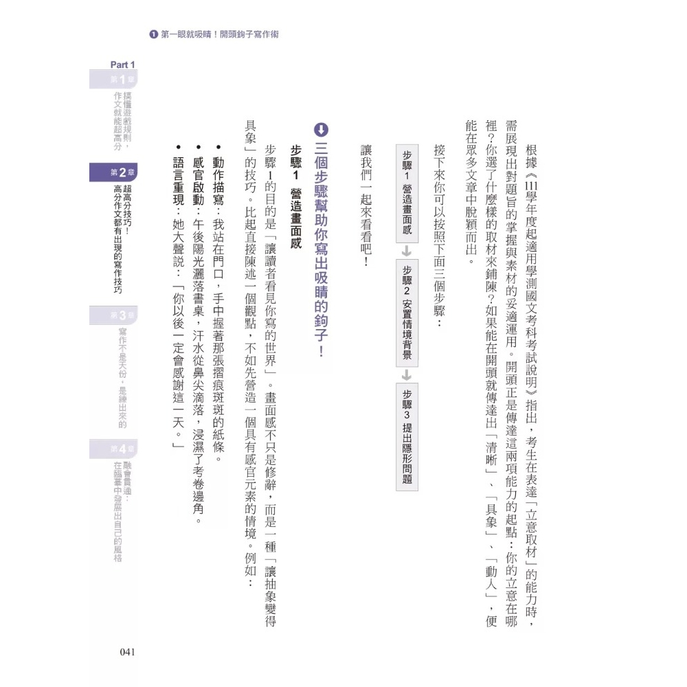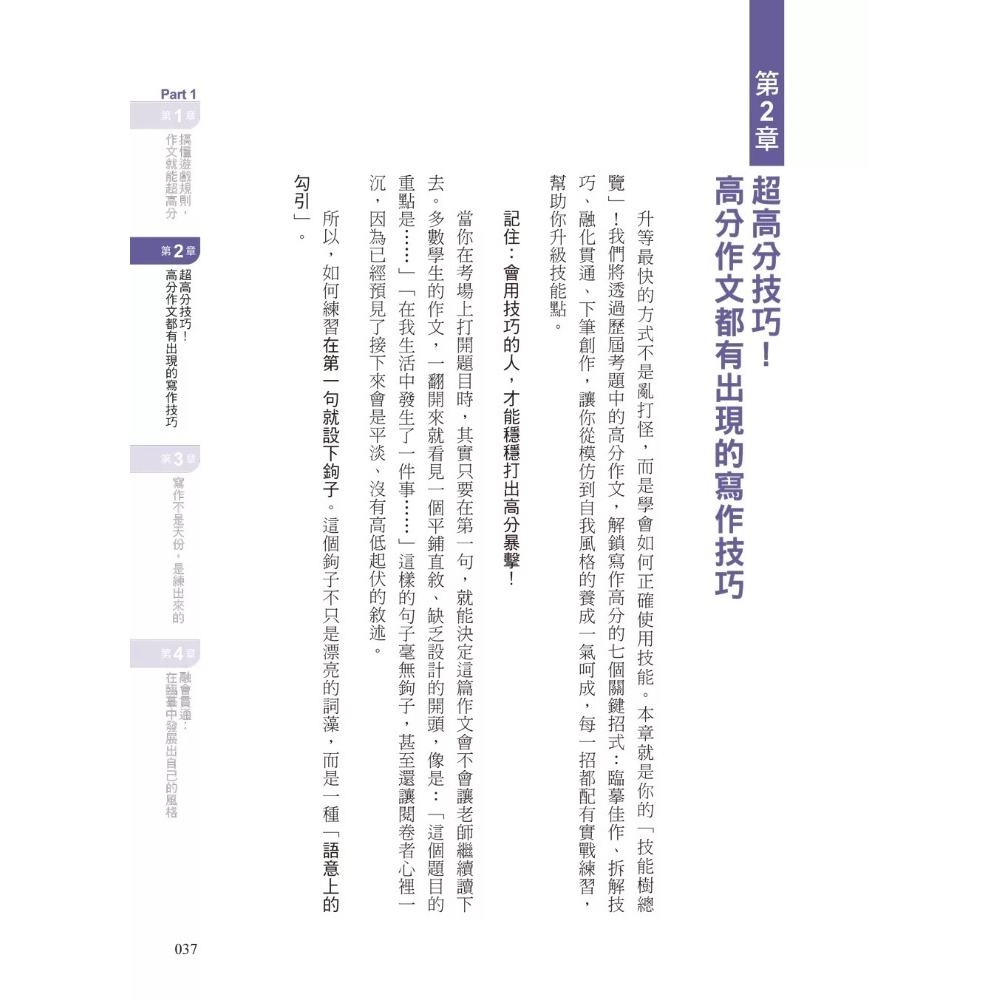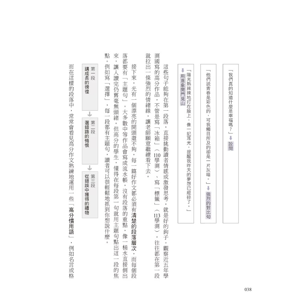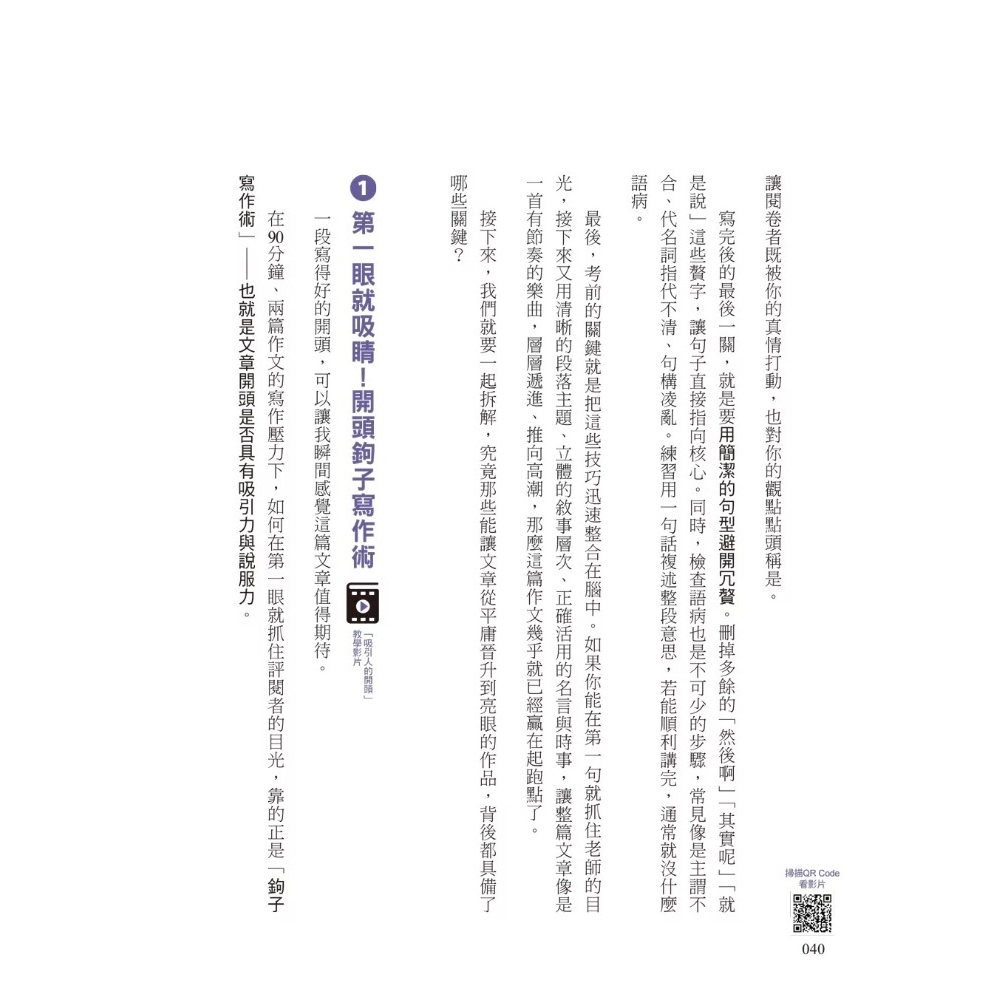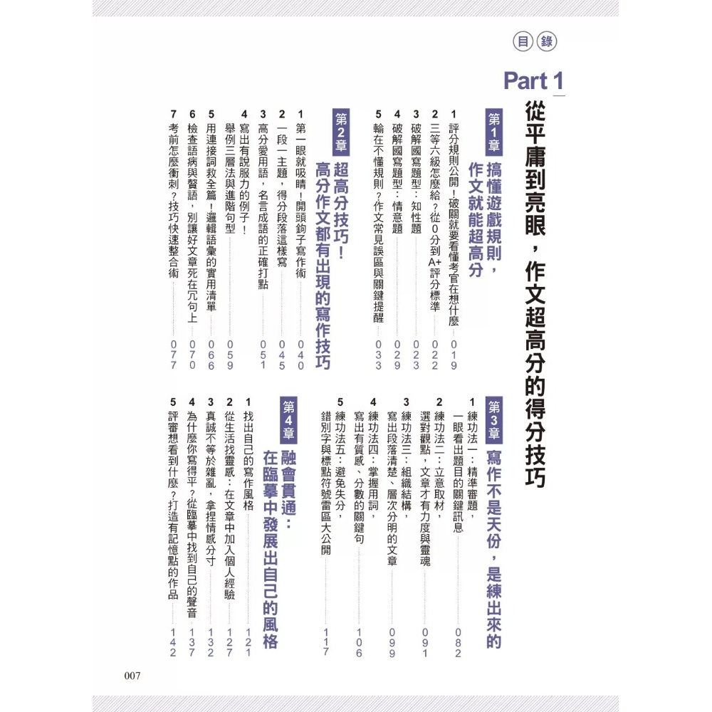在學會臨摹高分作文的寫作技巧之後,帶你從生活經驗中提煉故事,將個人觀點轉化為文章的亮點,讓文字中真正出現「你的聲音」。在文章中打造具有個人特色的記憶點,如此就能在十多萬份作文中脫穎而出,讓閱卷委員眼睛為之一亮,給出A+高分。