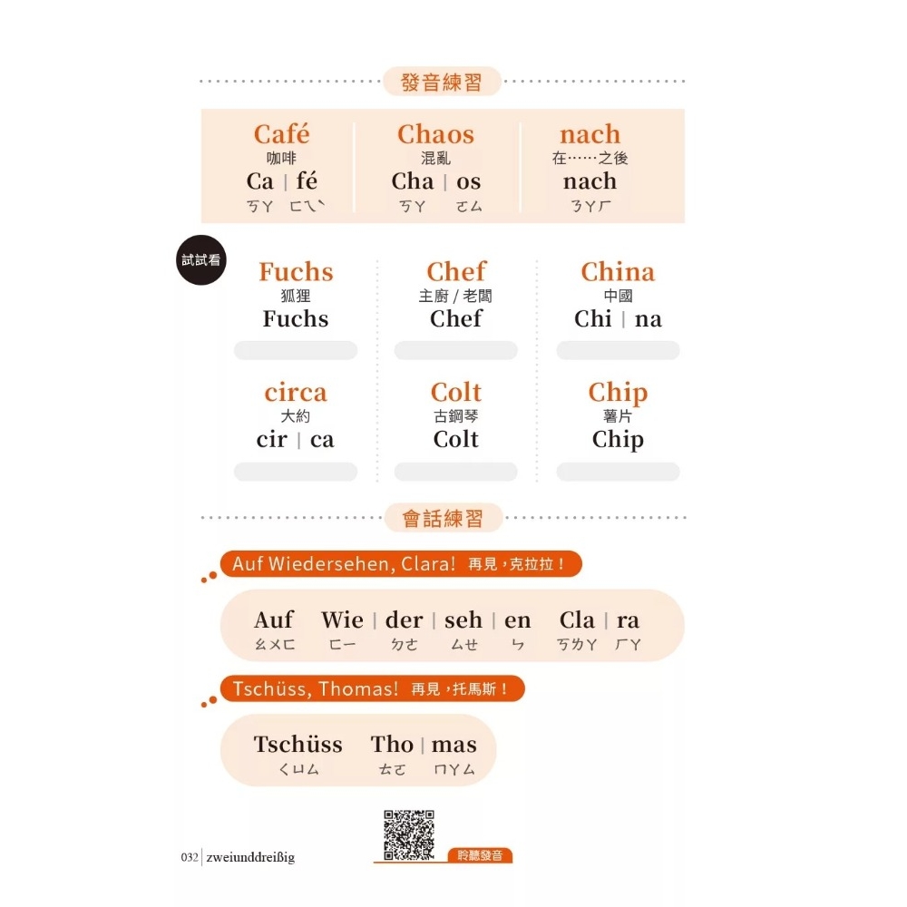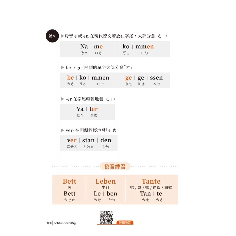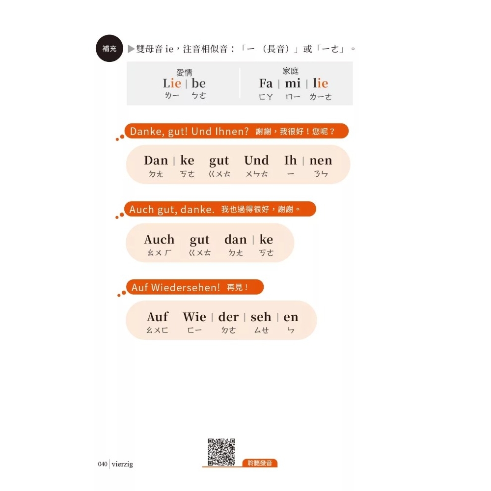 學習語言,第一步就是從最基本的字母、發音開始下手。德語發音其實不難,只要跟著作者特別設計的教材,會唸國語注音符號、就能跟著說出道地德語!發音不標準別擔心,母語人士錄製QR Code雲端音檔,絕對讓你學會最道地的發音和語調!