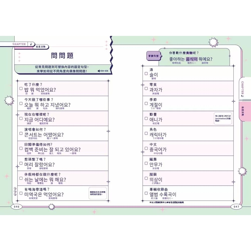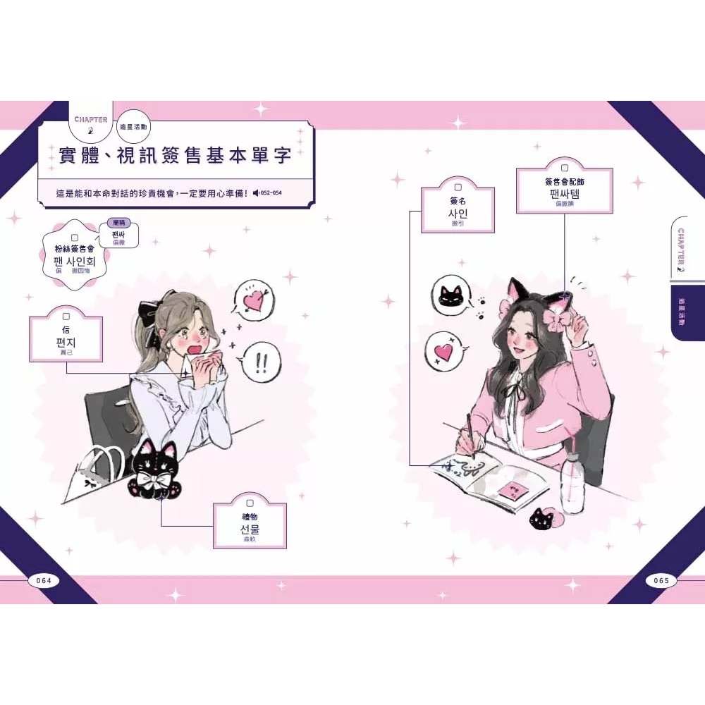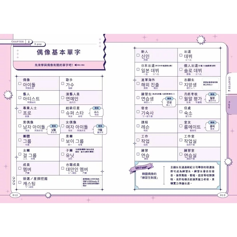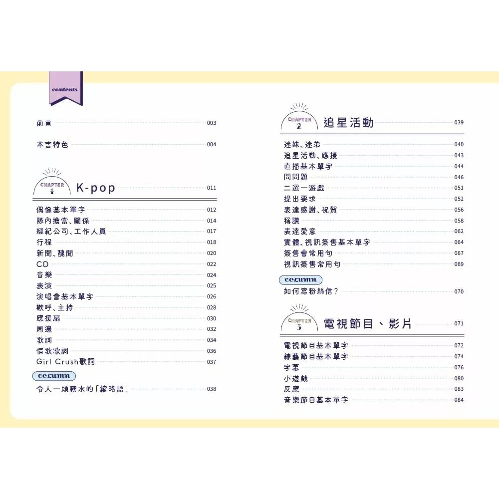 包含追星文化中常見的關鍵詞,例如「七年魔咒」、「葡萄粒」,以及如何用韓文寫信給偶像、甚至還有「어덕행덕」各種飯圈縮略語介紹,不只學語言,還能進化為飯圈專業戶,讓你追星追得有感、夠潮、超專業!