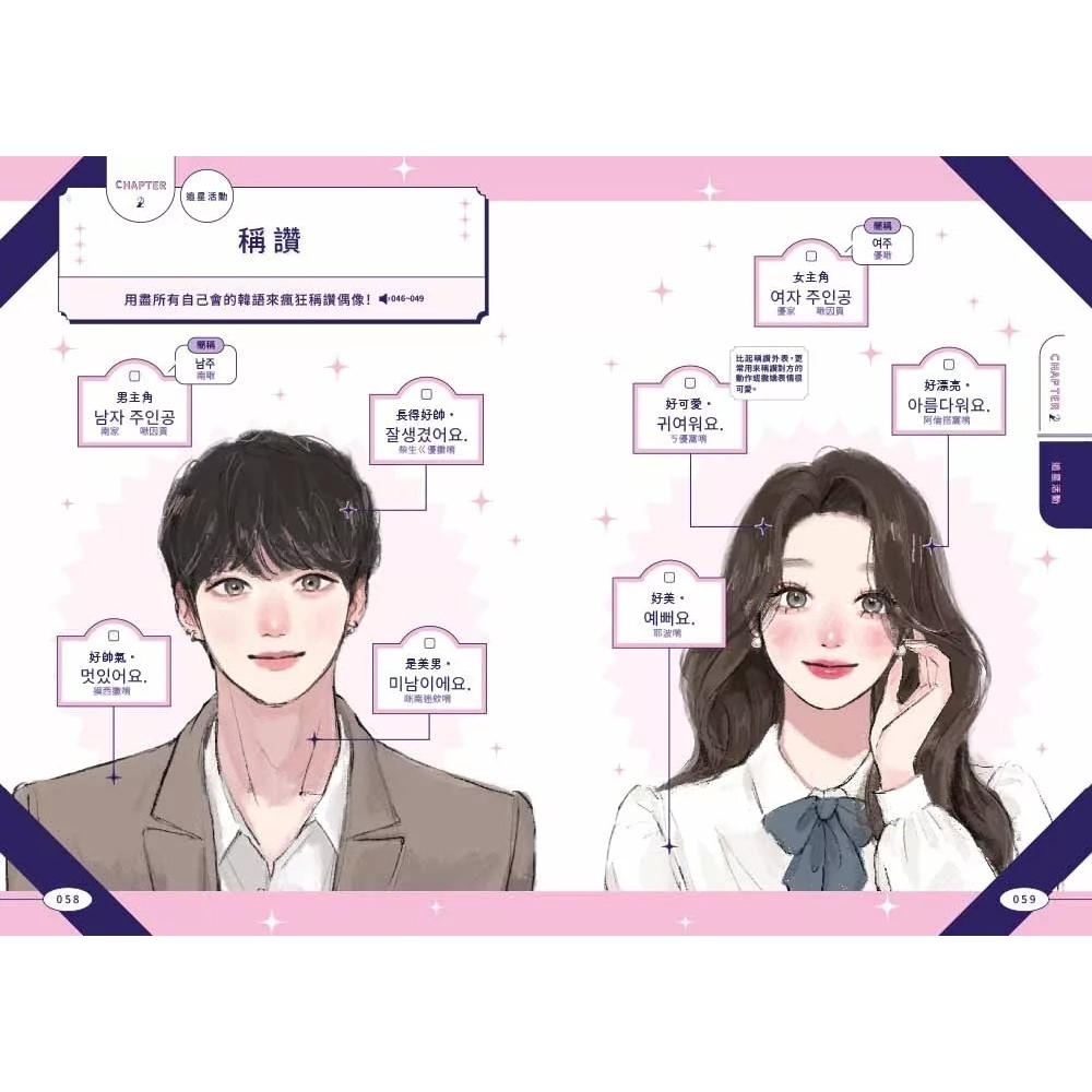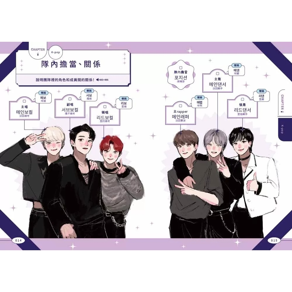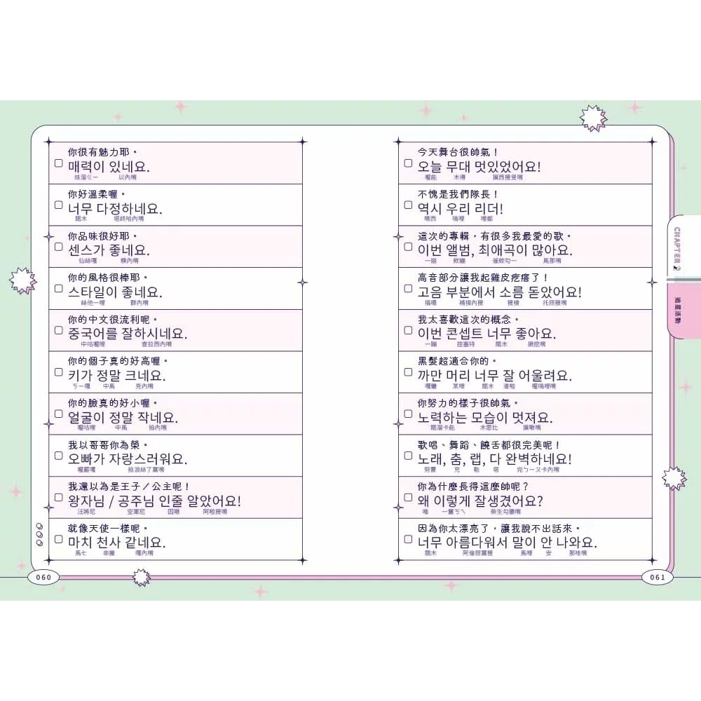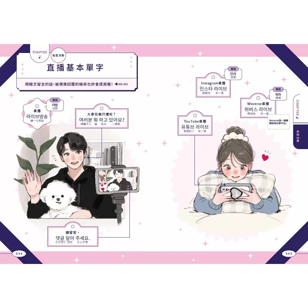 包含追星文化中常見的關鍵詞,例如「七年魔咒」、「葡萄粒」,以及如何用韓文寫信給偶像、甚至還有「어덕행덕」各種飯圈縮略語介紹,不只學語言,還能進化為飯圈專業戶,讓你追星追得有感、夠潮、超專業!