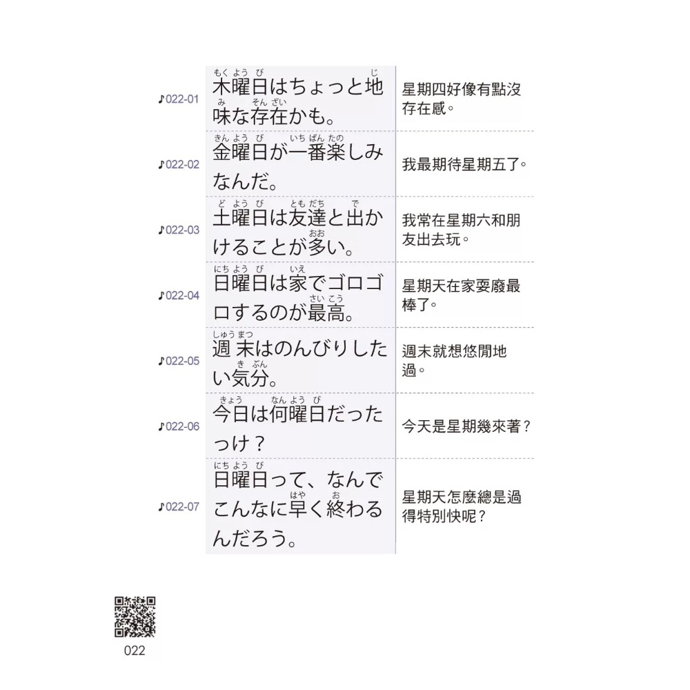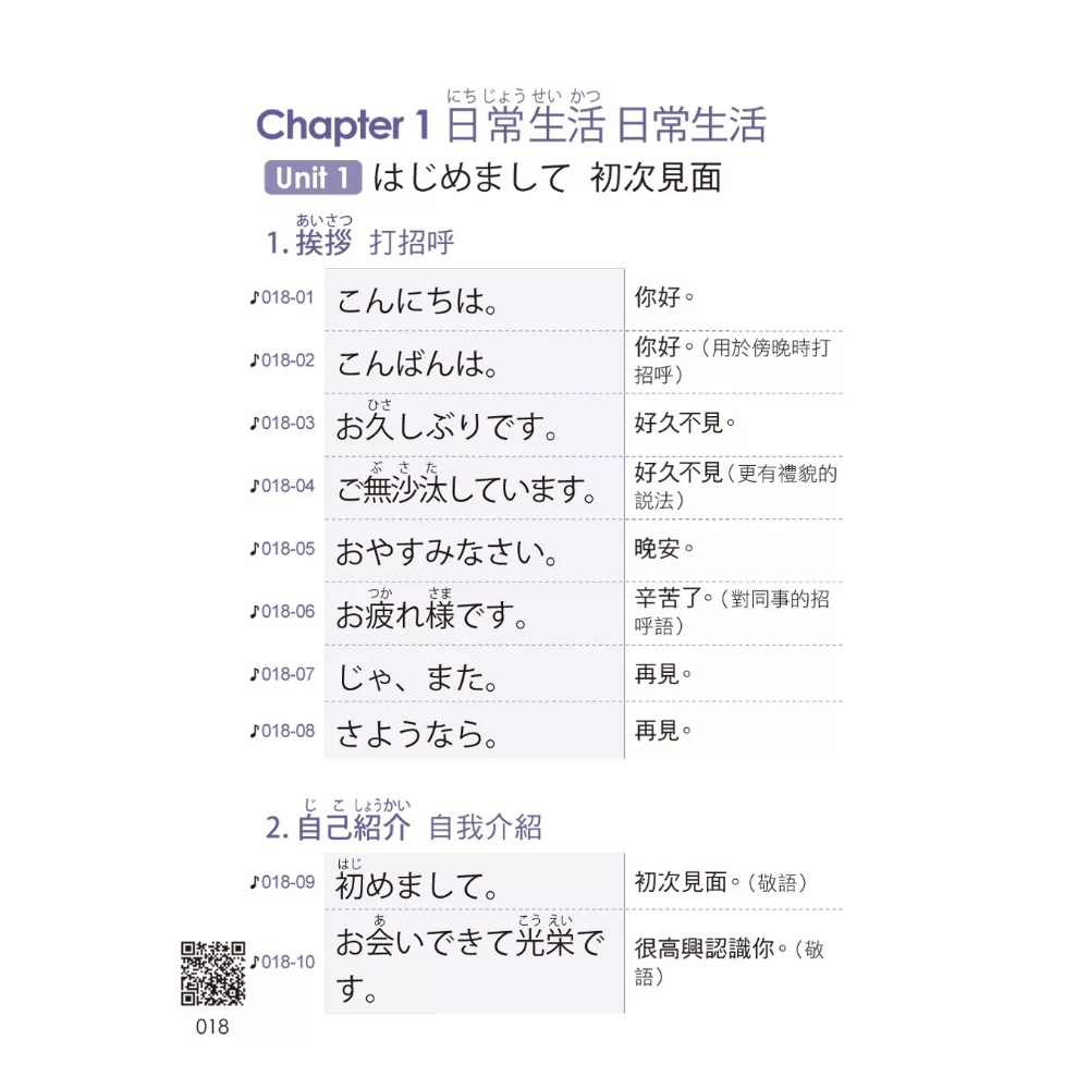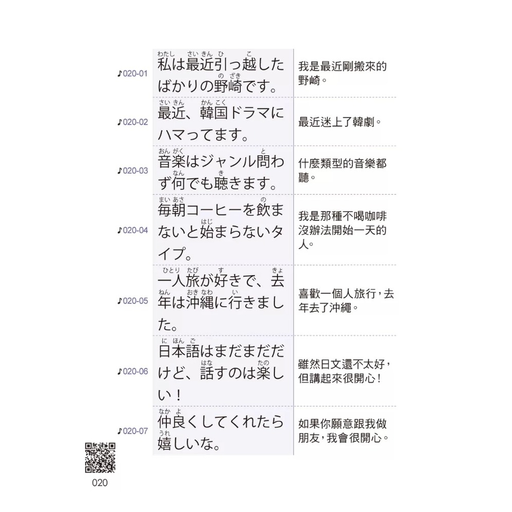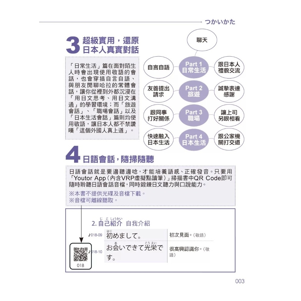 日語會話就是要邊聽邊唸,才能培養語感、正確發音。只要用「Youtor App(內含VRP虛擬點讀筆)」掃描書中QR Code即可隨時聆聽日籍老師的日語會話音檔,同時鍛鍊日文聽力跟口說能力。