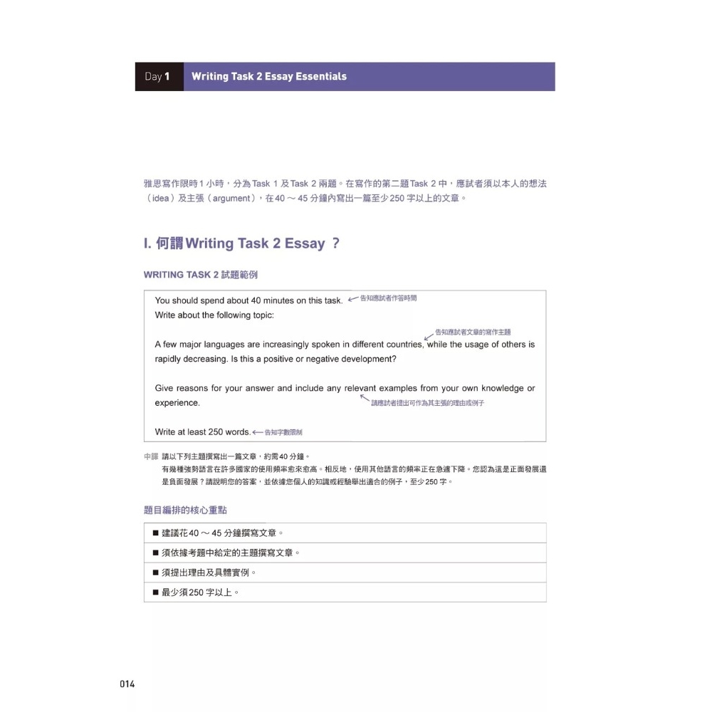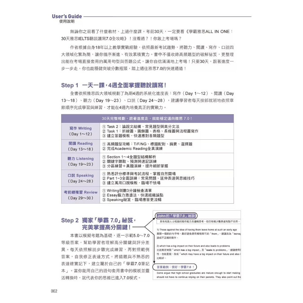 全書依照雅思四大領域規劃了為期4周的系統化進度表:寫作(Day 1~12)、閱讀(Day 13~18)、聽力(Day 19~23)、口說(Day 24~28),建議學習者每天按部就班地依照章節順序完成學習與練習,若進度過於緊湊,也可依自身情況調整,穩定且持續的學習節奏比短時間的密集衝刺更有效,唯有每日堅持,才能在4週內培養真正的實戰力。