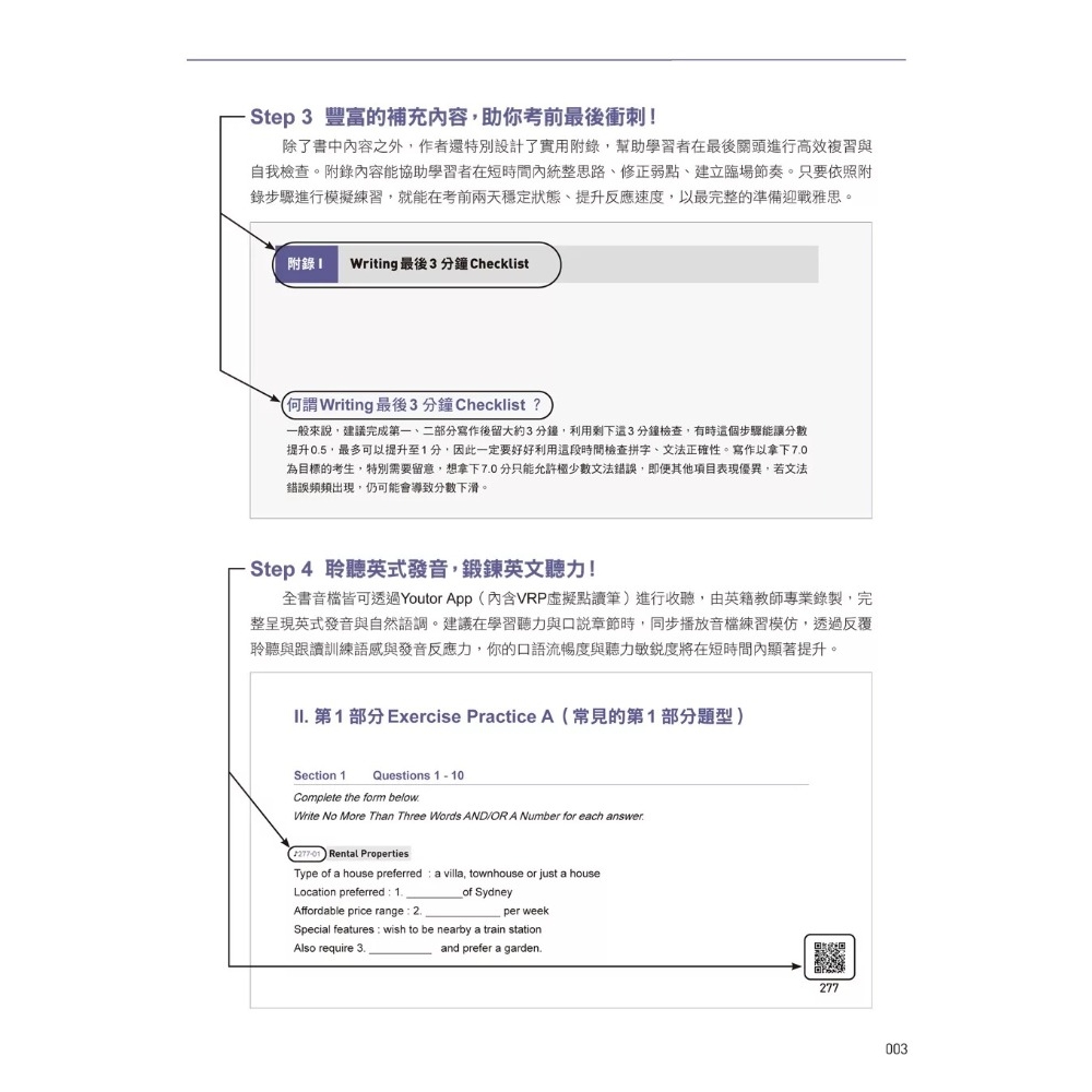除了書中內容之外,作者還特別設計了實用附錄,幫助學習者在最後關頭進行高效複習與自我檢查。附錄內容能協助學習者在短時間內統整思路、修正弱點、建立臨場節奏。只要依照附錄步驟進行模擬練習,就能在考前兩天穩定狀態、提升反應速度,以最完整的準備迎戰雅思。