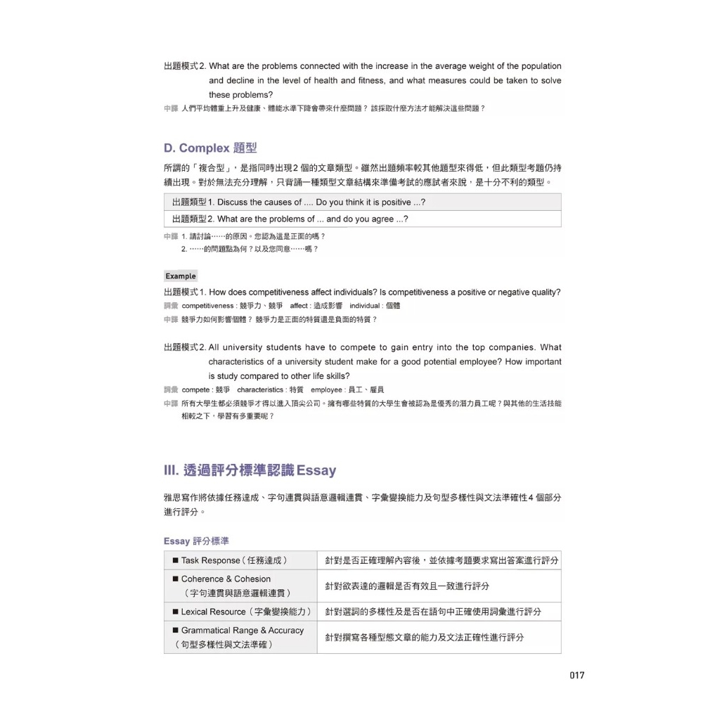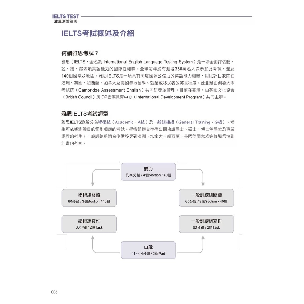 寫作部分聚焦Task 1圖表題與Task 2論說文結構;閱讀包含是非、配對與摘要題;聽力依四大Section分析題型與答題策略;口說則從Part 1日常問答到Part 3延伸討論皆有實戰指導。