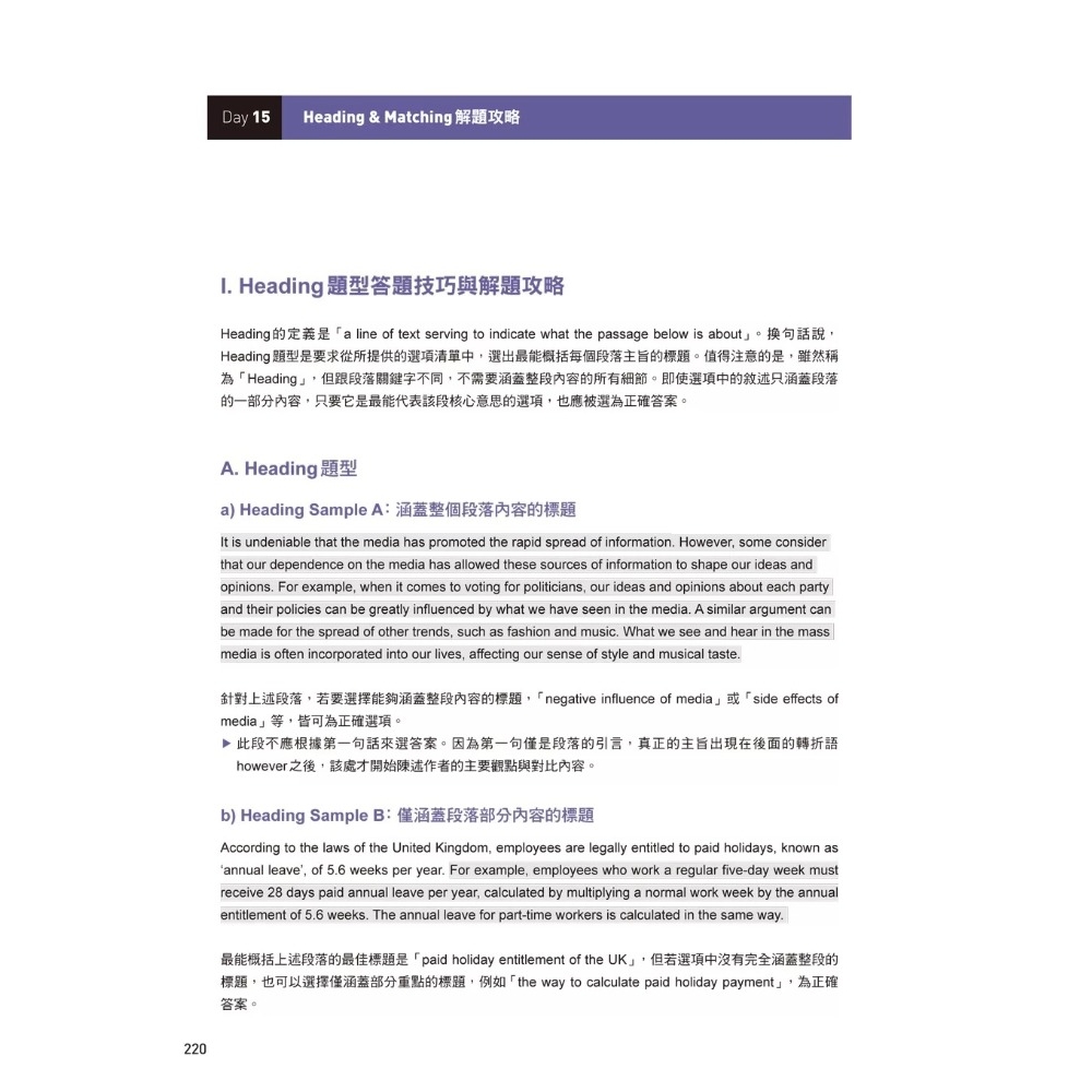 前12天訓練寫作架構與高分文法,13至18天掌握閱讀題型,19至23天專攻聽力四大Section,24至28天練習口說Part 1至 Part 3的回答策略。