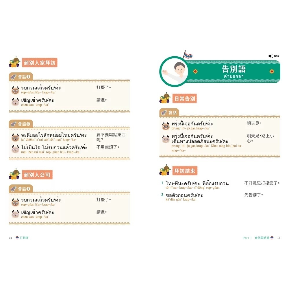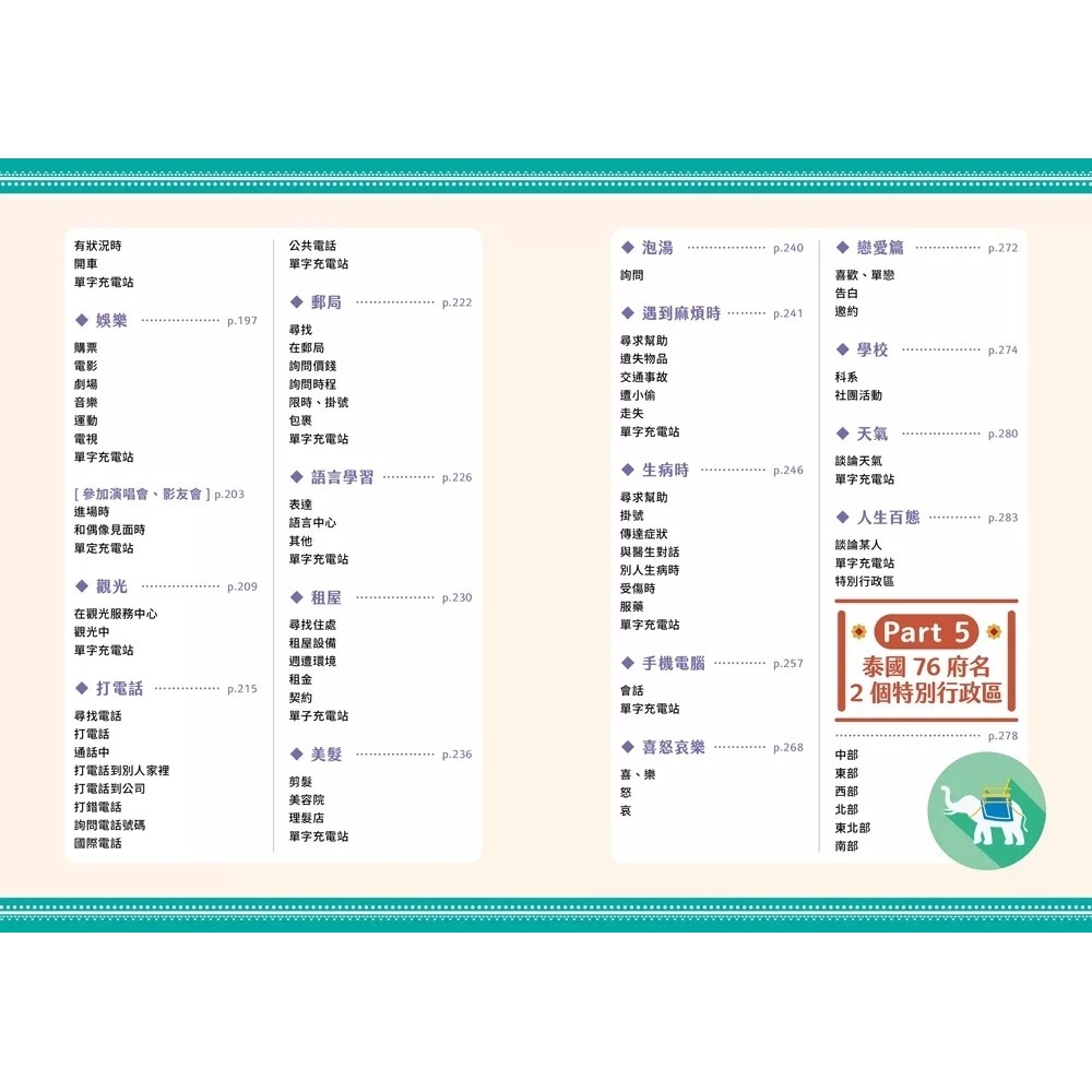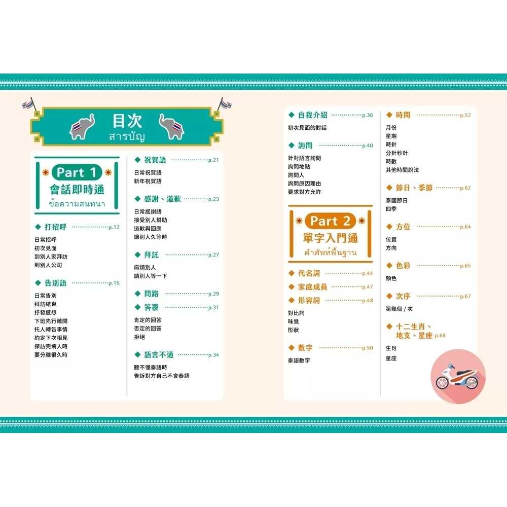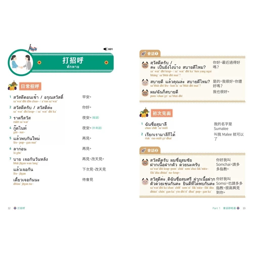 全書共分成五大章節,以循序漸進的方式,引導讀者們學習泰語。第1~3章介紹基本的泰語生活用語;第4章介紹泰國旅遊的實用會話例句;第5章介紹泰國的行政區域,讓讀者能透過此書增進泰語實力。