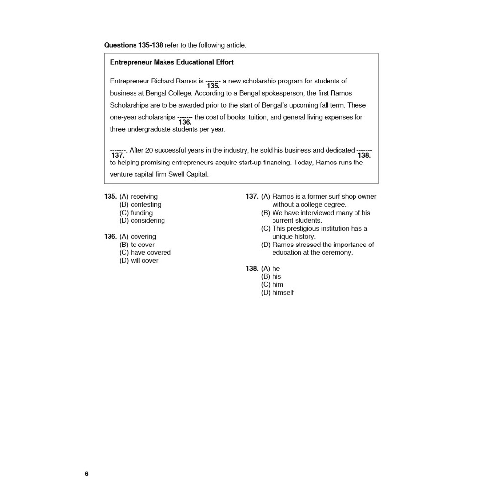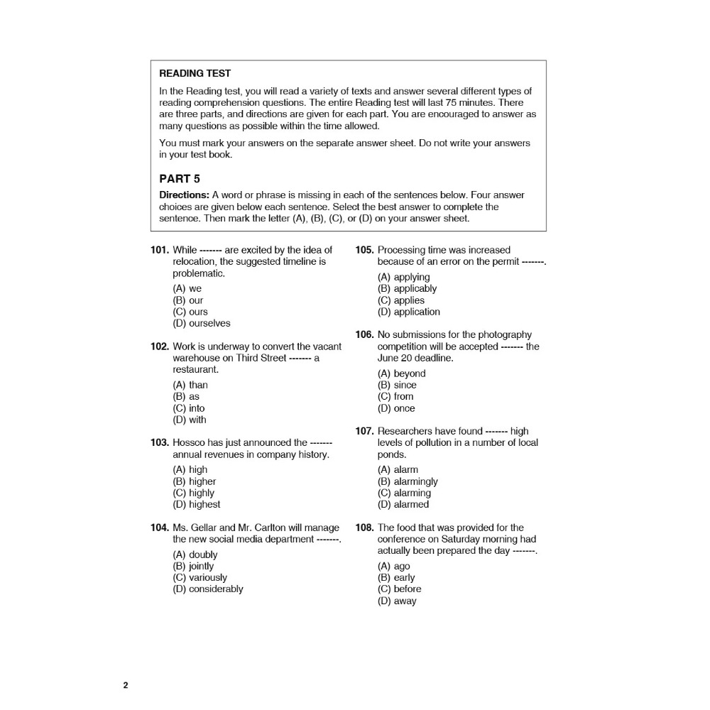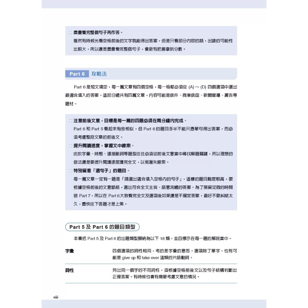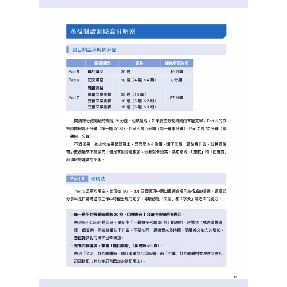 本書由教學團隊進場應試超過千次,歸納分析最新的出題趨勢,編寫「100 x 5回」共500題閱讀模測,涵蓋Part 5「單句填空」、Part 6「短文填空」以及Part 7 「閱讀測驗」。題材多變不重複,讓考生演練實際上場的閱讀測驗。