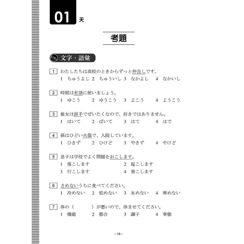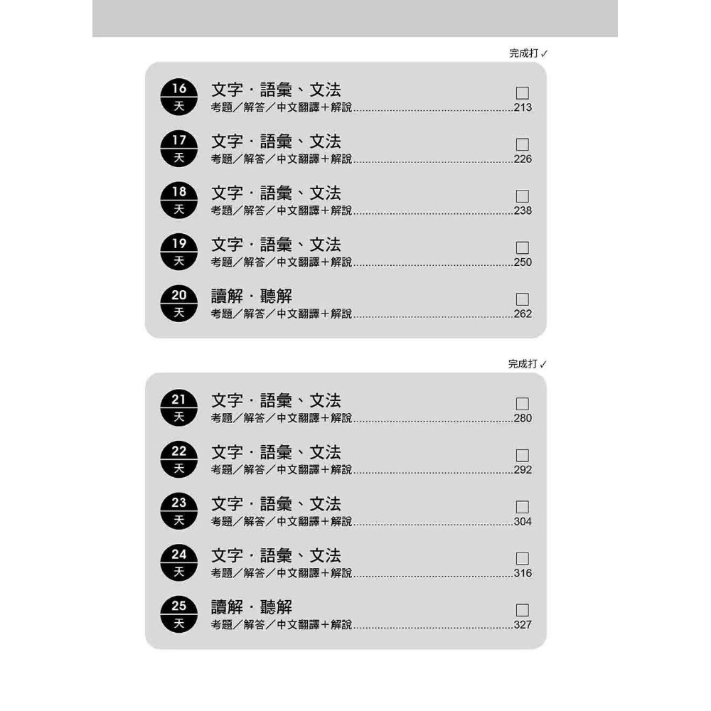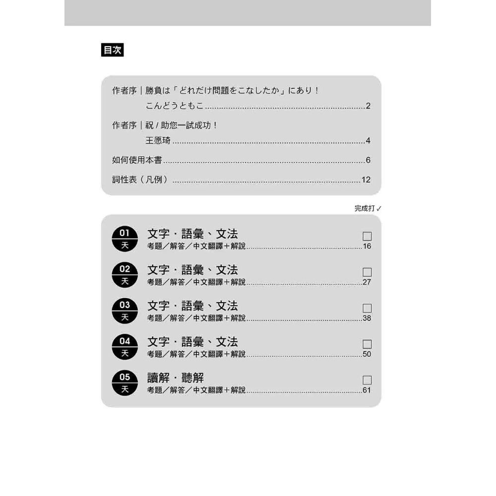 ‧以每5天為一週期:前4天練習「文字・語彙」、「文法」2科,每天20題,厚植實力;第5天熟悉「讀解」、「聽解」2科,每次11題,融會貫通!