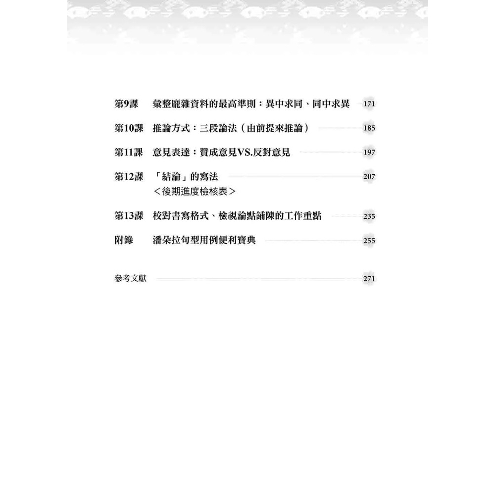 在撰寫論文之前想要多方參考一下前人的論文?不需要上圖書館,本書蒐集了數篇目次、序論、結論範例,學習完課程內容,立即能參考應用!例如第12課中所列舉出的「結論」基本版與進階版寫作模式與範例,參考價值高!