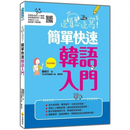 學習韓語從40音到簡單基本的單字及句型,跟著《邊聽邊寫!簡單快速韓語入門》一邊聽一邊寫,保證記得住,入門韓語再也不是難事!想無障礙暢遊韓國嗎?韓語不必多,有這些就夠了!