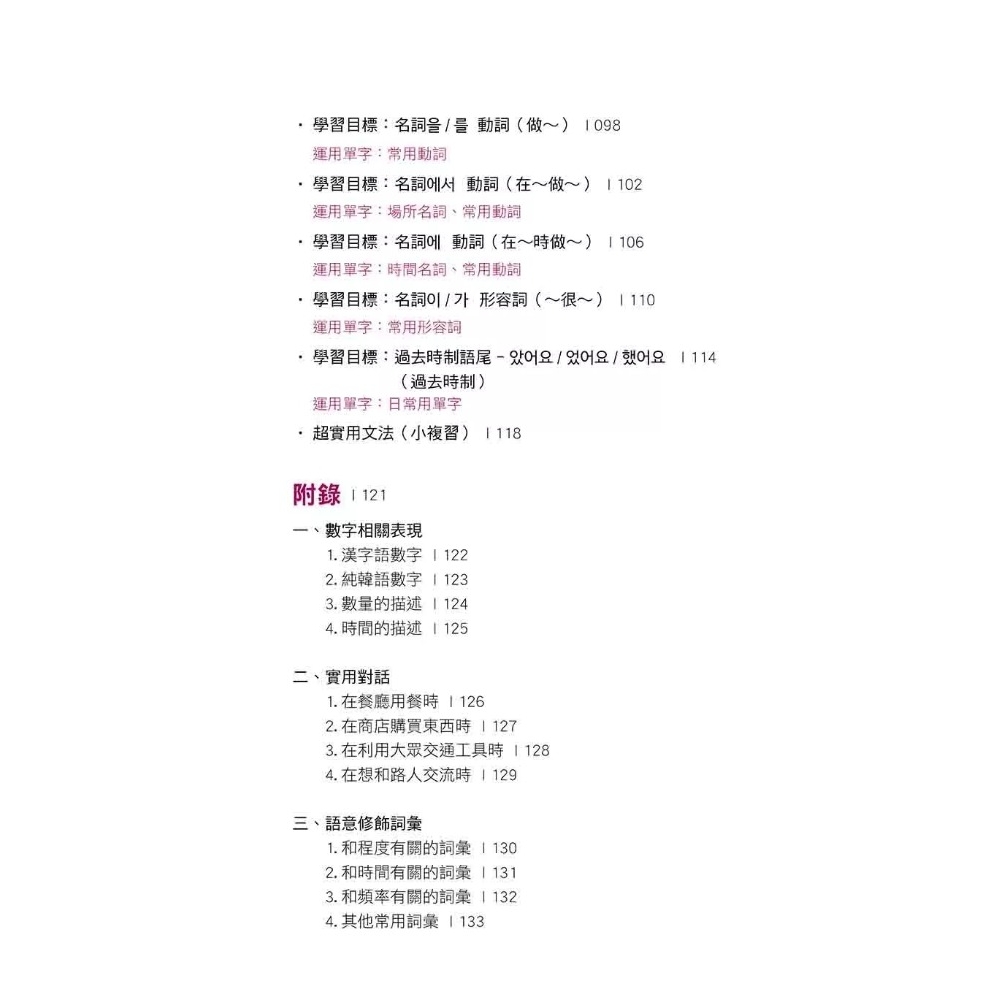 學習到這,是不是還想了解更多韓語呢?更多的實用韓語都在附錄中!「數字」、「時間」、「日期」等實用單字,「餐廳」、「購物」、「交通」等實用對話,「程度」、「頻率」等常用詞彙都匯集在此,一起來試著活用這些內容吧!