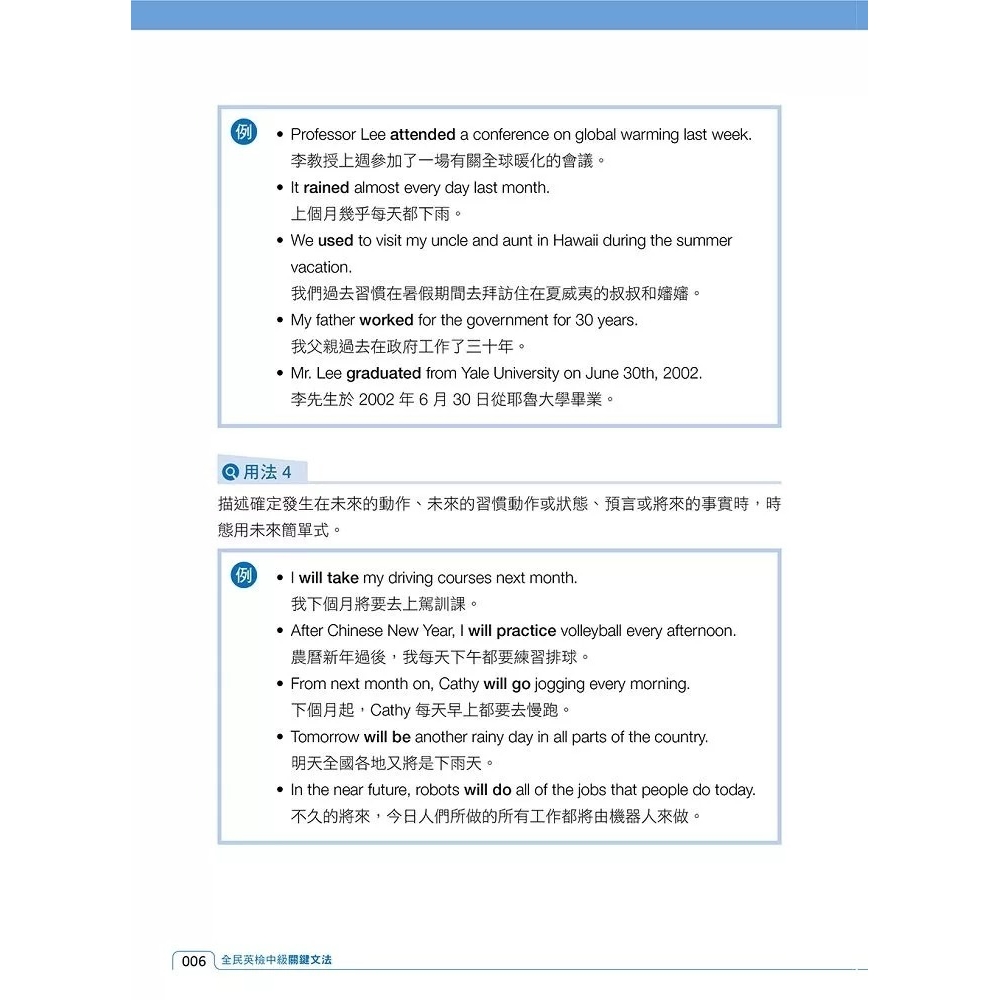 ◆實用例句輔助 每項文法皆提供實用例句,有助解析長篇閱讀。