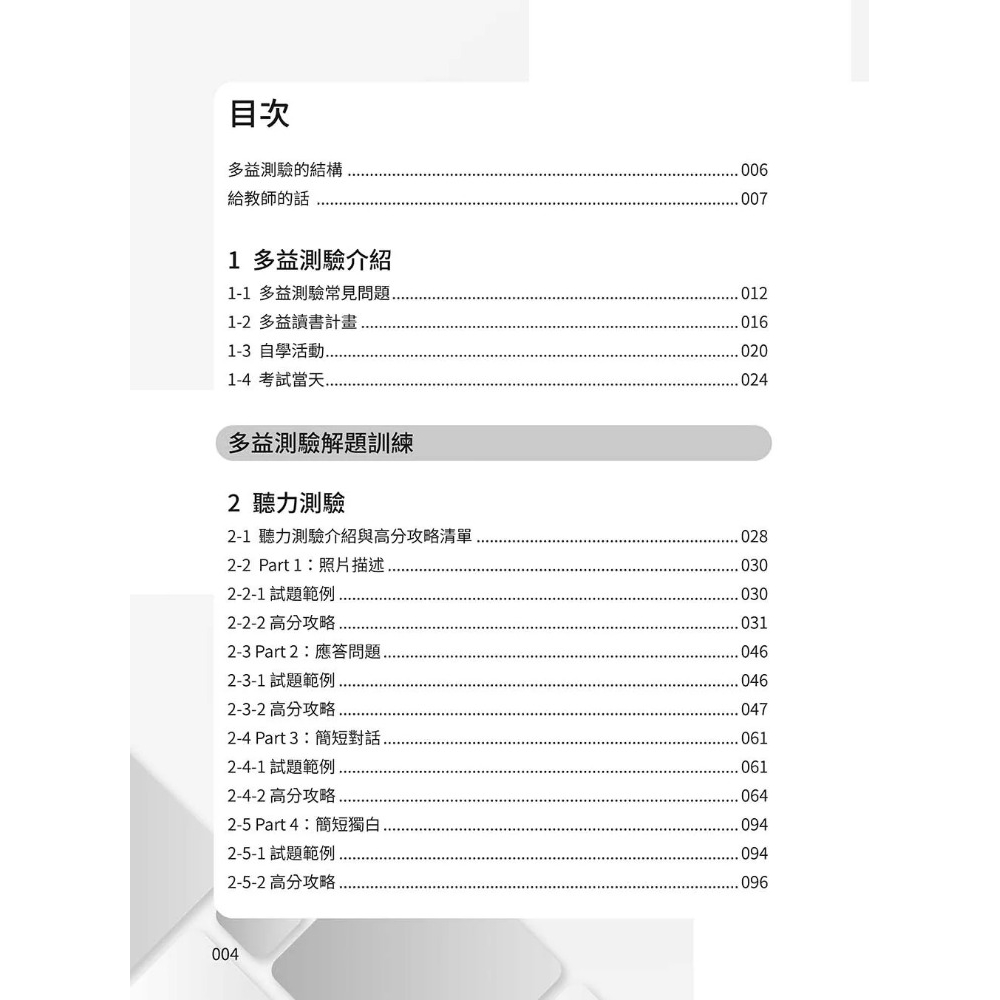 每單元於範例題型後皆有能迅速檢核理解度的小練習,於聽力及閱讀部分最後則有診斷測驗可進行統整訓練,考生不但能聚焦特定試題進行重點式複習,也能透過集結各類題型的診斷測驗來提升應答速率並鍛鍊出穩健實力。