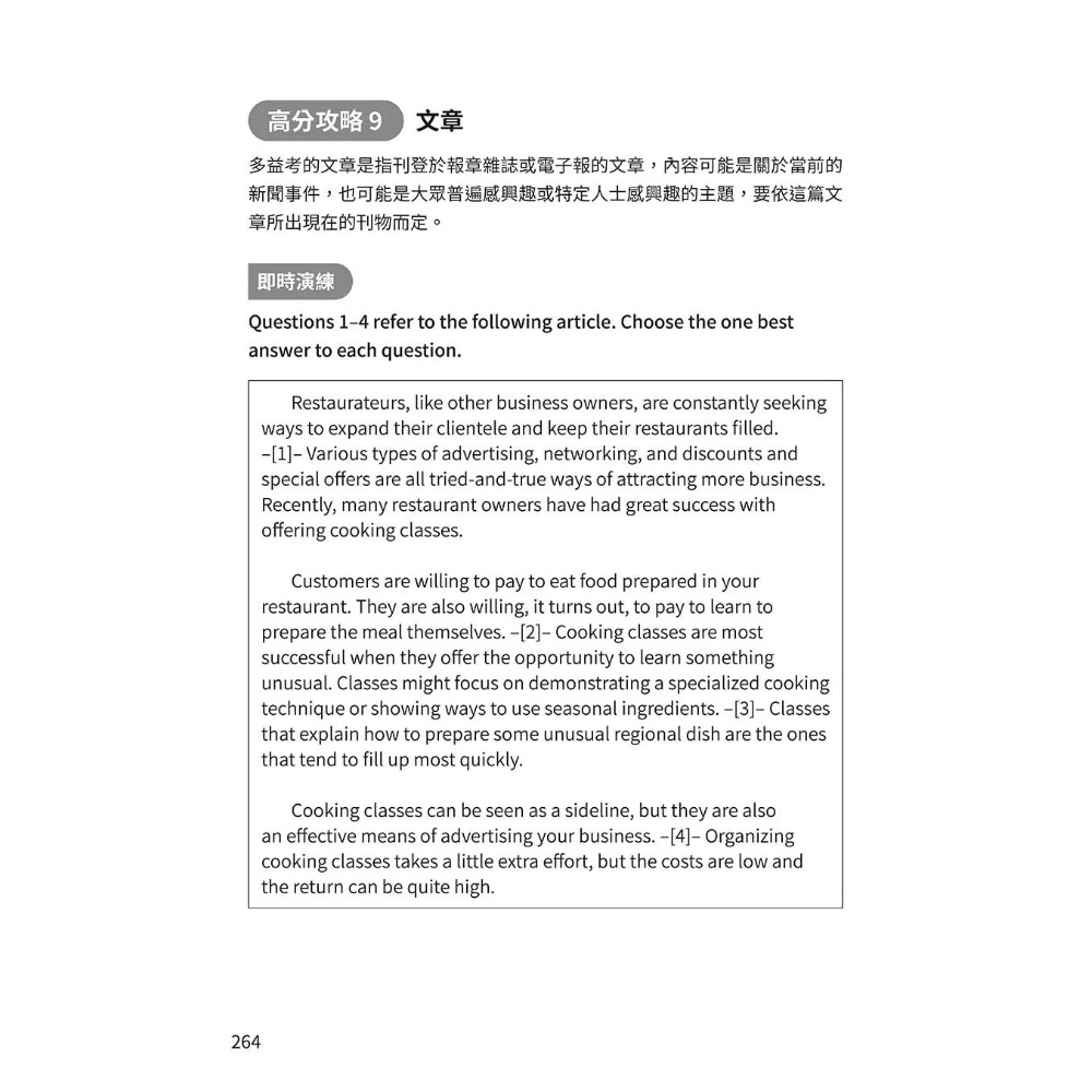 閱讀測驗是眾多考生的罩門,於所剩無幾的時間內,在最後面臨多益測驗需一次閱讀多篇文章時,因同時要內化理解的文字量極大,很多人可能會慌了手腳。本書提供PSRA策略,先閱讀簡介句與題目並預測(Predict)文章內容,掃視(Scan)整體文章及選項並找出關鍵字詞,接著快速讀過(Read)所有文章,最後於答案卡上作答(Answer)。只要遵照上述步驟,作答高難度篇章也能游刃有餘!