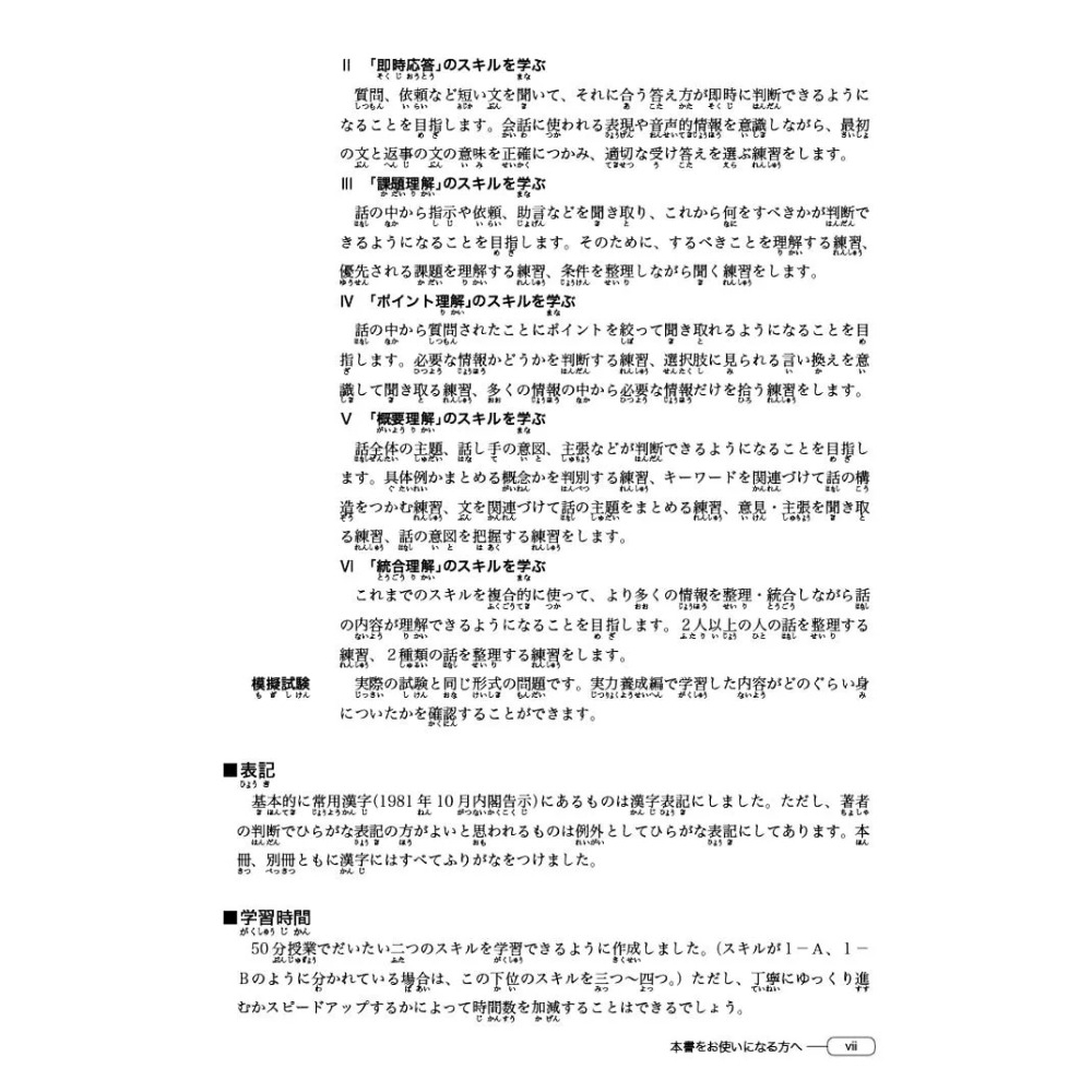 依聽解五種出題形式「理解課題」、「理解重點」、「理解概要」、「即時回應」、「統整理解」分章編排,介紹各種題型出題形式,讓學習者有個整體的題型概念。