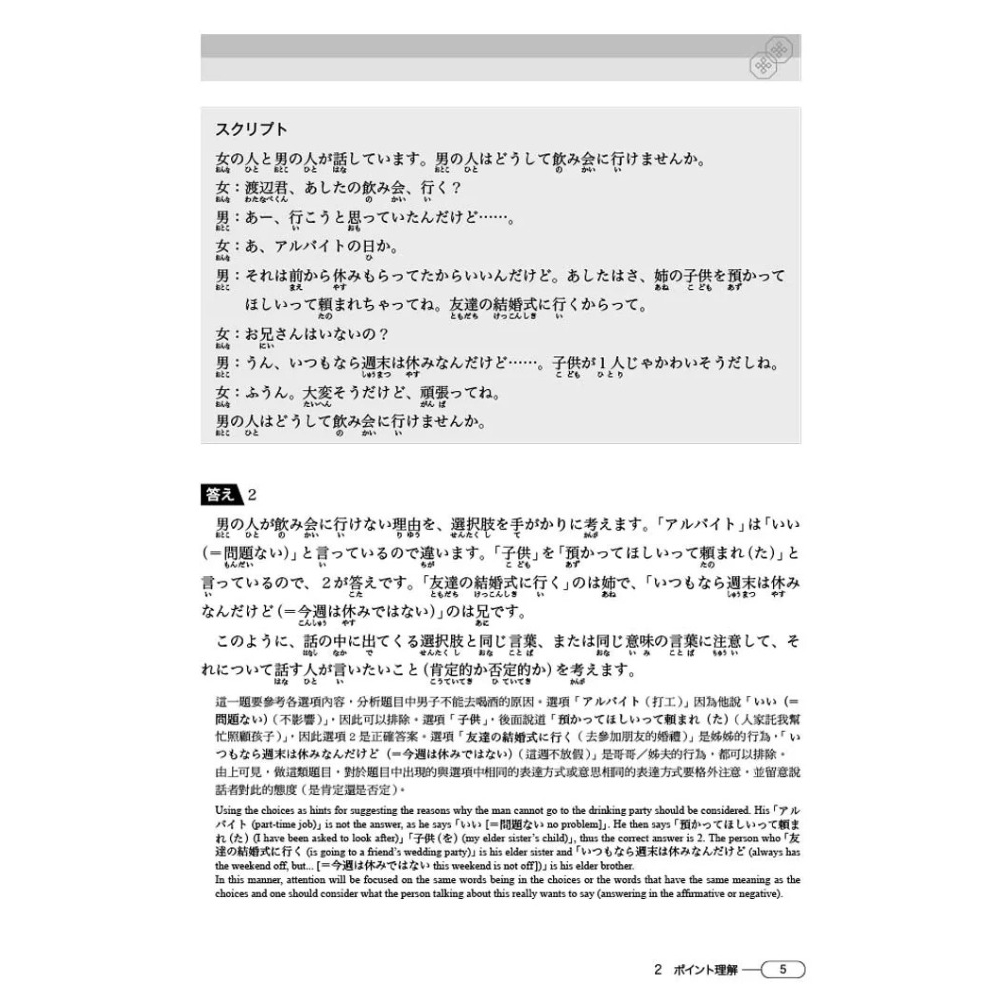 依聽解五種出題形式「語言表達」、「即時回應」、「理解課題」、「理解重點」、「理解概要」分章編排,介紹各種題型出題形式,讓學習者有個整體的題型概念。