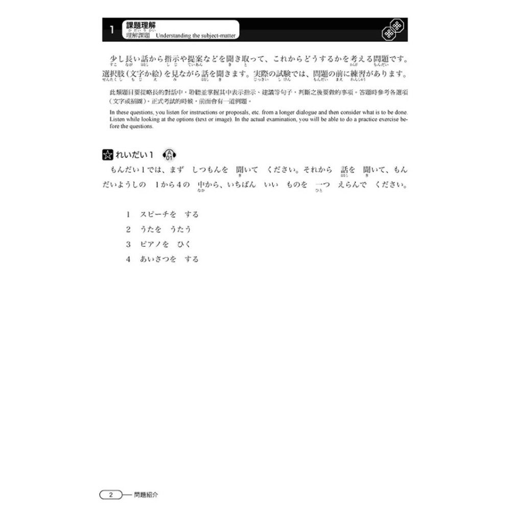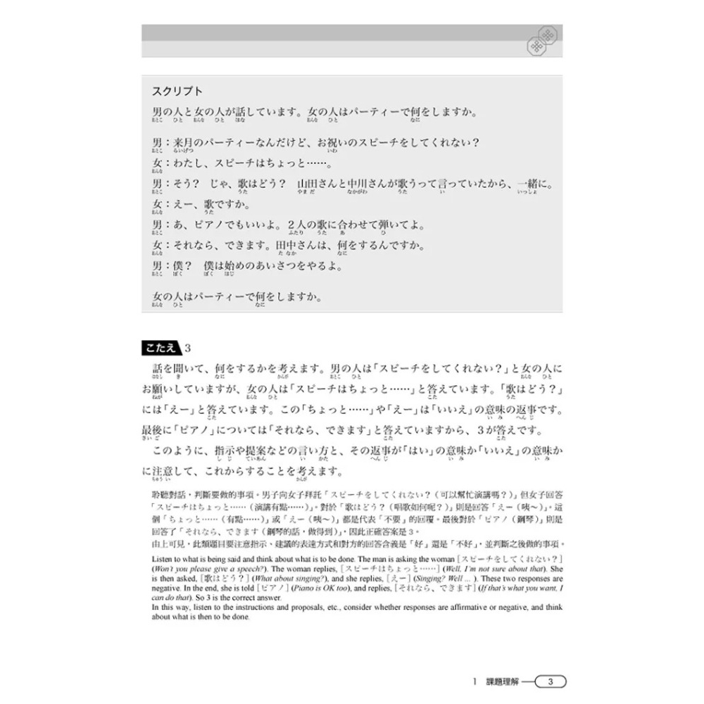 依聽解四種出題形式「理解課題」、「理解重點」、「語言表達」、「即時回應」分章編排,介紹各種題型出題形式,讓學習者有個整體的題型概念。