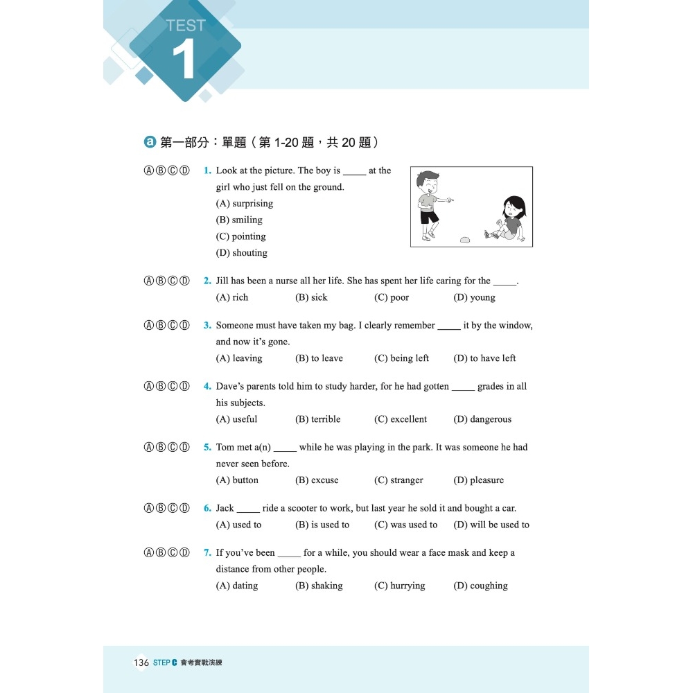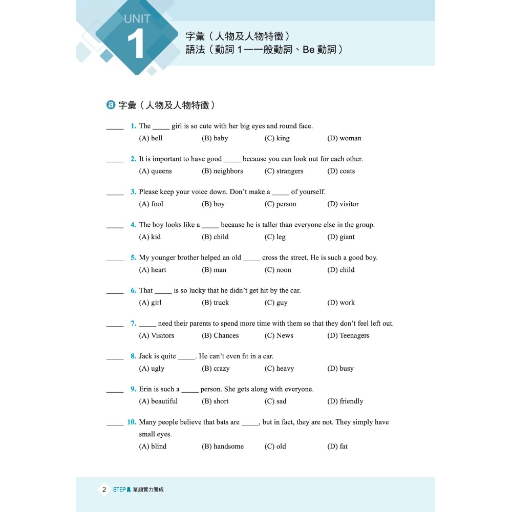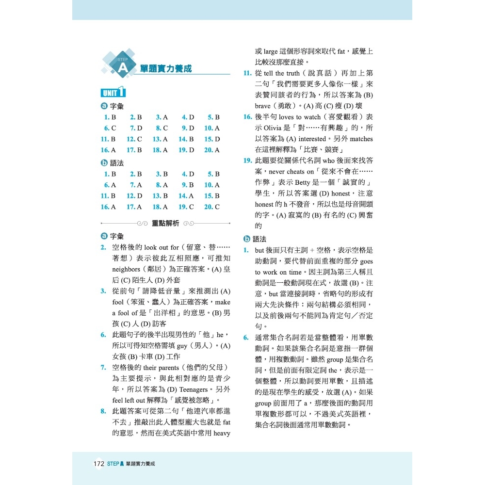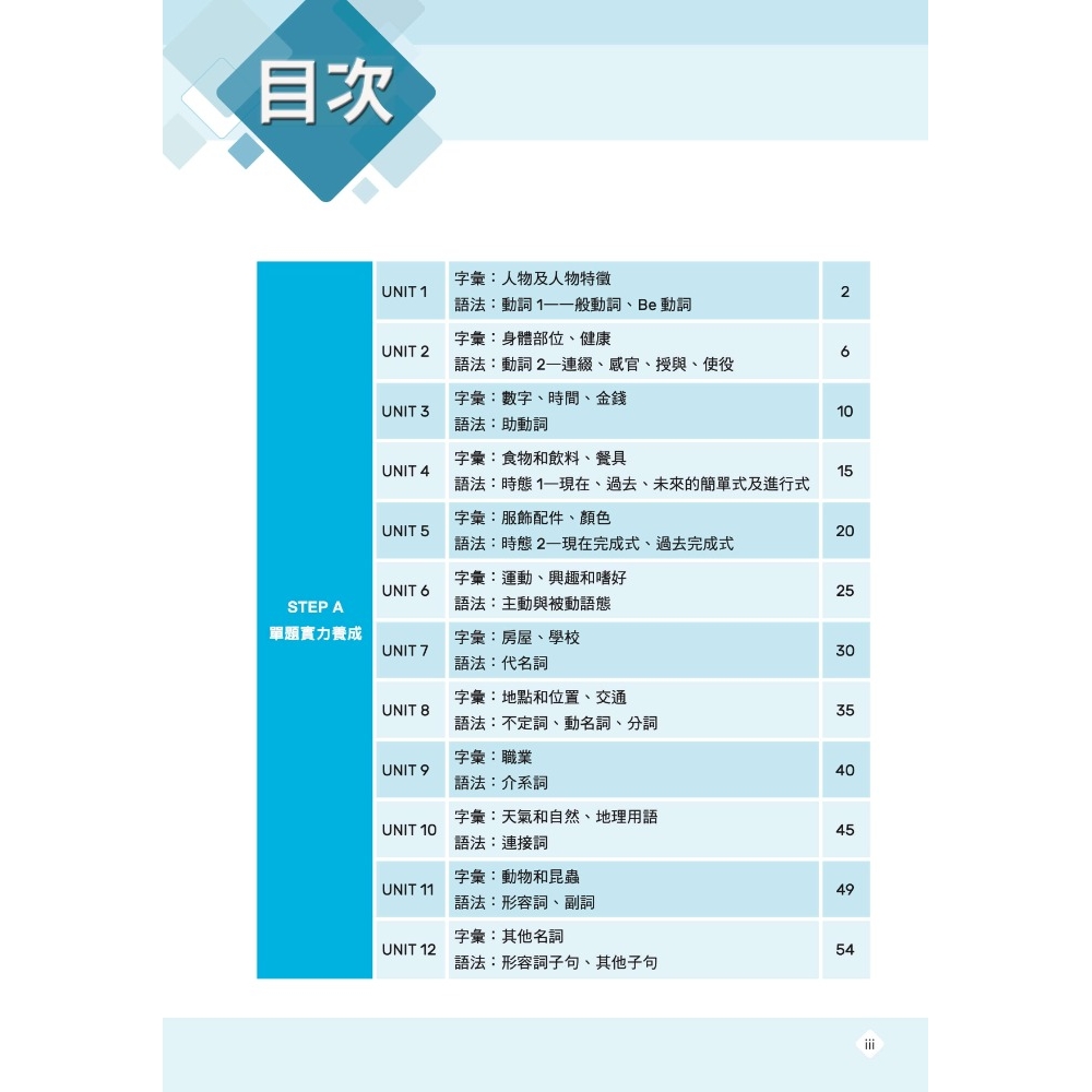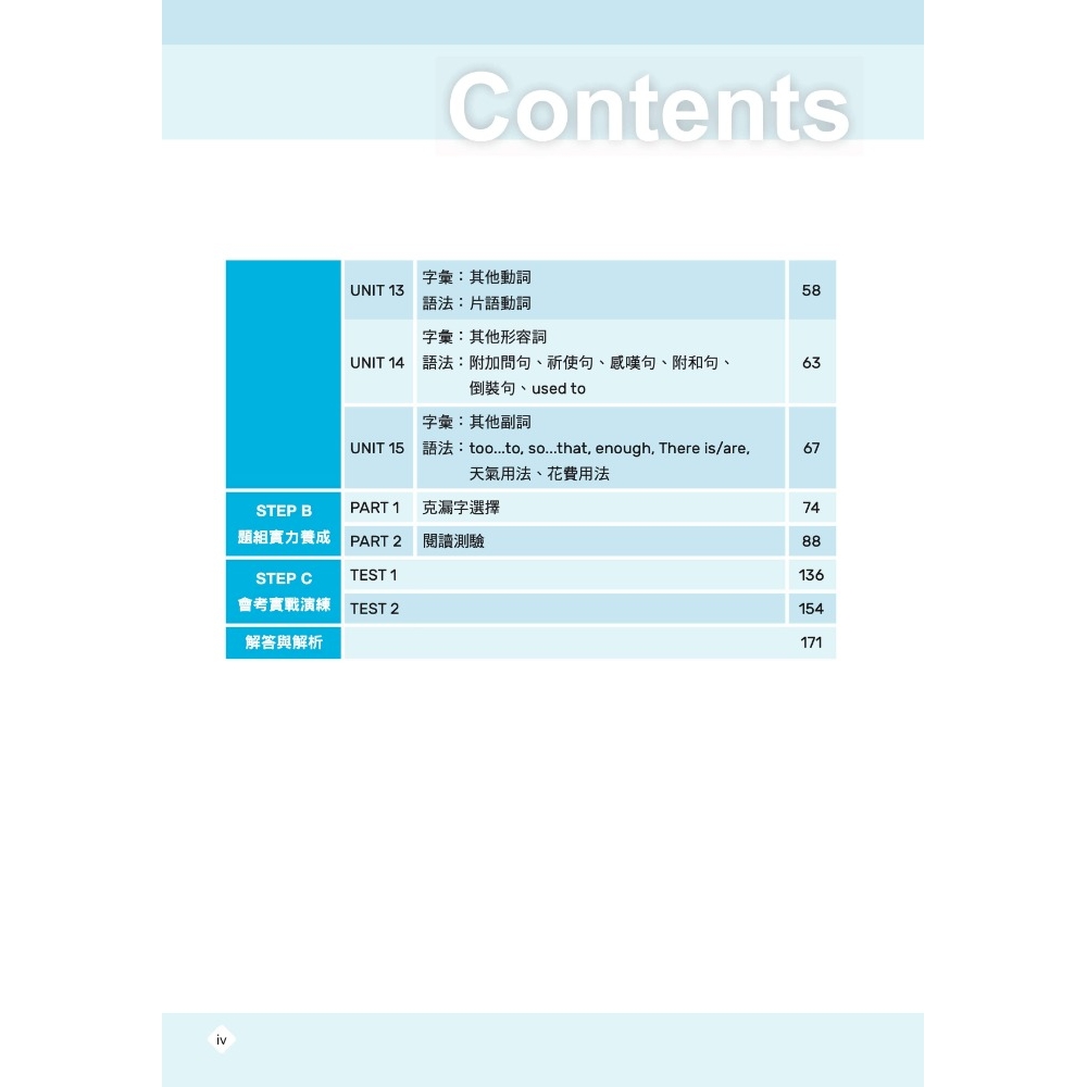 在STEP A中,將應考範圍的單字主題及語法重點分為15個單元,便於考生逐一檢視並複習各語法重點及單字主題的應考實力。培養單題解題實力是基礎中的基礎,必備的字彙量和語法知識將在這裡得到全面提升,考試之路藉此打下堅實基礎。