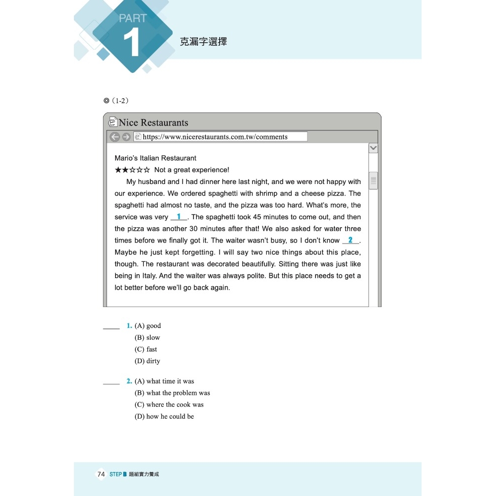 接著,在STEP B,提供豐富且多元,更具挑戰的題組,包括克漏字題組及閱讀測驗題型。透過大量的練習,將不僅加強考生的解題能力,還能提升閱讀速度和心理素質,使考生能夠更從容地應對各種考試挑戰。