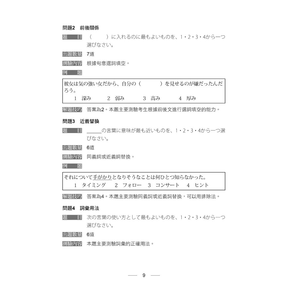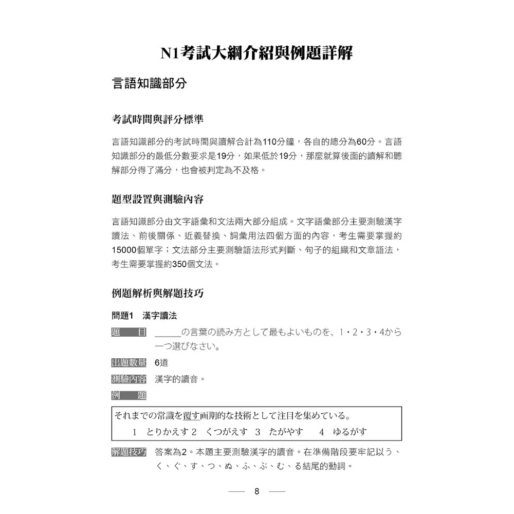 本書全面剖析N1題型,從考試時間、評分標準到測驗內容逐一說明,並提供精選例題解析與解題策略,讓技巧在反覆練習中落實,協助讀者建立穩定作答思路。