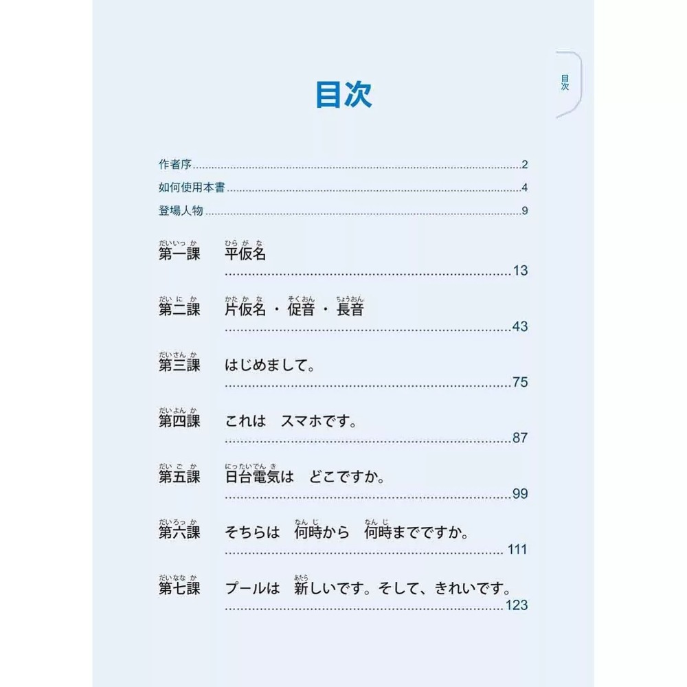 全書共分為10課,內容由淺入深,前兩課從平假名與片假名入手,搭配筆順練習、實用單字、可愛插圖,讓學習者能完整建立日語發音與文字基礎,為後續學習打下穩固根基。第三課開始正式進入生活會話,透過「はじめまして。」、「これはスマホです。」等8個超好學的實用情境,引導學習者循序漸進地認識基本文型。實用情境與實際生活緊密結合,涵蓋詢問地點、營業時間、描述事物狀態、日常興趣,以及簡單的過去經驗與感想表達等,讓學習者不只是學會日語基礎文法,還學了就能用,馬上就能開口說!