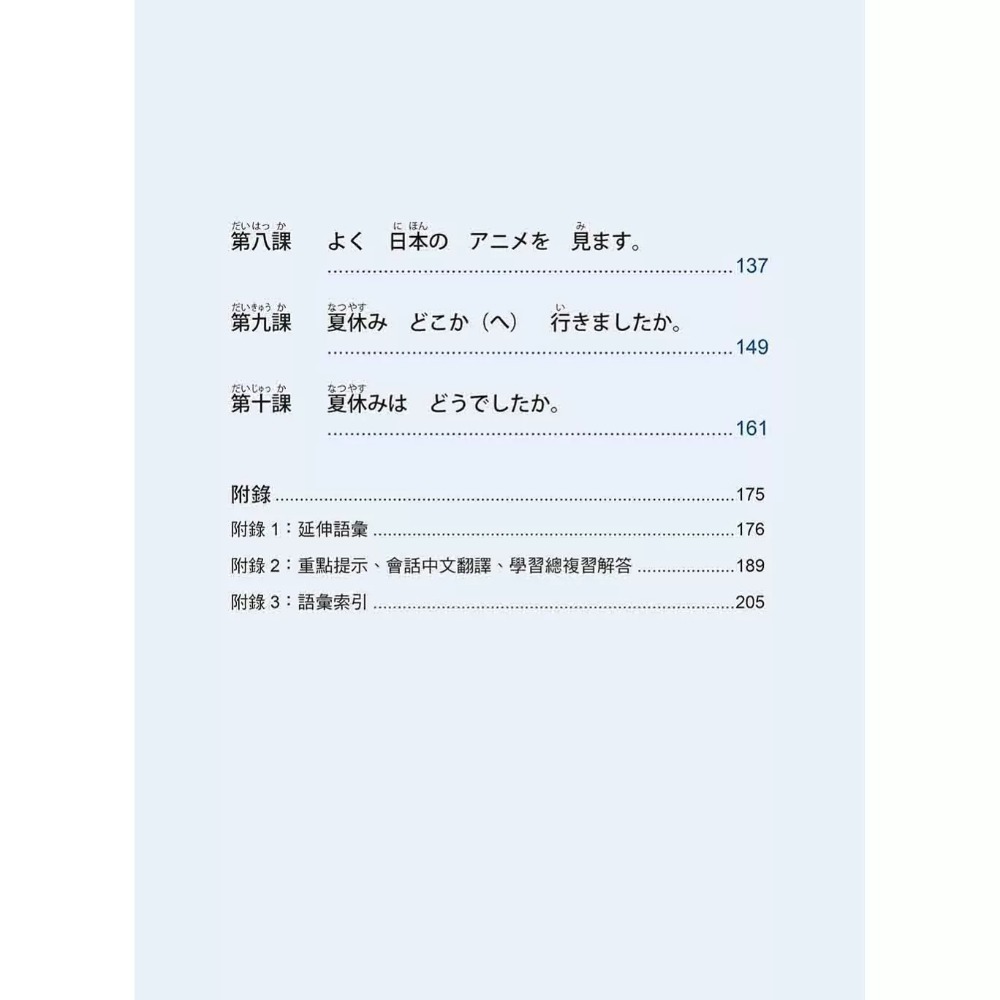 全書最後的附錄還有時間數量的延伸語彙、重點提示、會話中文翻譯、學習總複習解答,以及語彙索引,讓學習者在學習正課之後,更容易查找複習。此外,書封的QR Code附有日籍名師親錄標準日語發音+朗讀音檔,掃描即可下載聆聽學習,幫助您學會一口標準的日語!