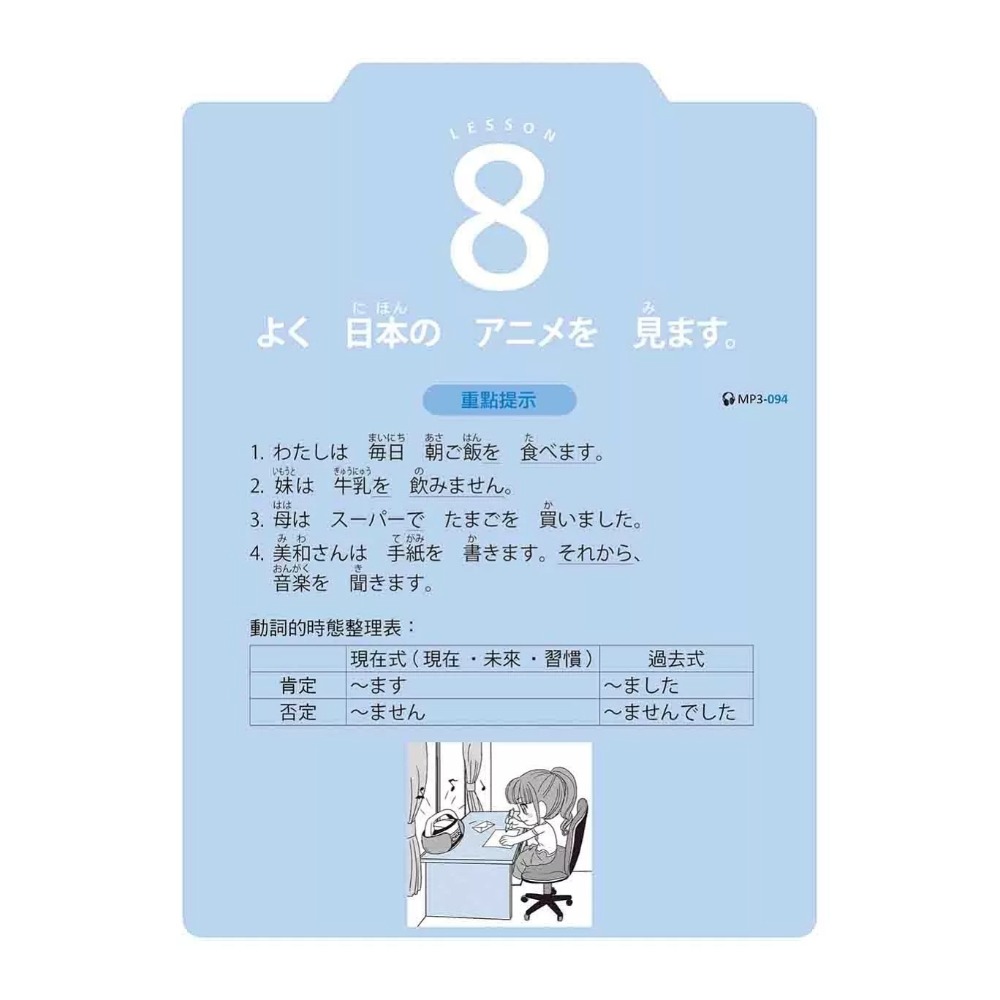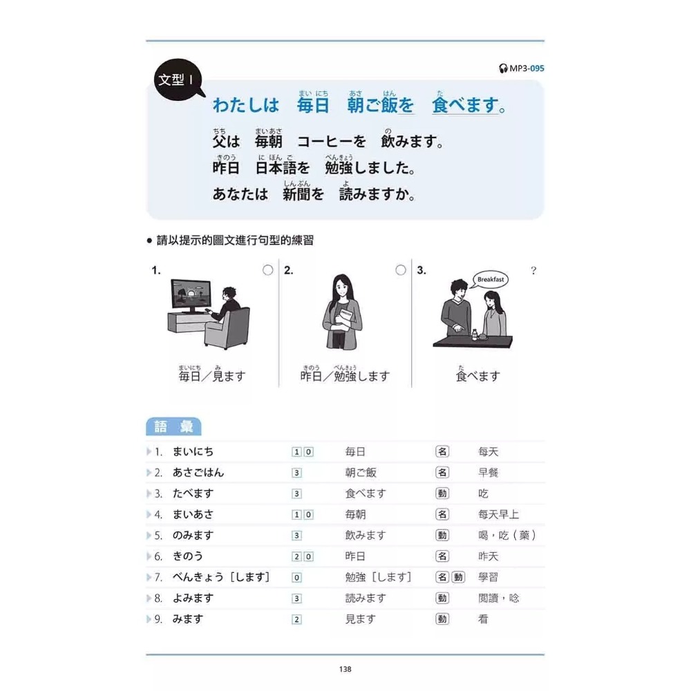 列出每課必學的重點文型,並透過代換練習,讓學習者學習最實用的生活日語,並融入日語的生活情境中。