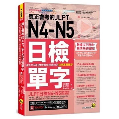 「時間有限、腦力有限!」要背就背真正會考的單字!「數據決定勝負,精準就是權威!」本書橫跨15年、共30回的日檢考古題大數據分析,透過「電腦」精密統計出現頻率,並由日檢N1滿分王「人腦」嚴格篩選,從上萬詞彙中去蕪存菁,精煉出 1,550個「核心必考單字」!如果你只有三個月、一個月,甚至一週就要進考場,你需要的只有「真正會考」的那一個單字!如果你只求高分過關,而不是要考滿分,那為什麼要浪費時間去背「根本不會出現在考卷上」的單字?這一次,我們不走冤枉路,這一次,我們只背一定會考的日檢單字!這15年來,會考的單字都在這裡了!如果考卷只會出現這1,550個核心單字,為什麼你要浪費時間背不會考的單字?數據說話!直擊JLPT N4-N5命題核心,最精準的選字、最道地的用法,讓你帶著「正確答案」踏進考場!數據決定勝負,精準就是權威!用最高效率,換取N4-N5合格證書!■ 15年大數據命題導航,讓你每一秒的努力都有價值蒐集近15年、共30回的考古題庫,利用大數據分析技術與專家二度篩選,徹底排除冷門、過時、低頻單字。這不僅是一本單字書,更是一份精準的命題地圖,確保你學的每一個字,都是考官的出題重點。■ 1,550個核心單字高效攻略:不只背單字,更能看穿考題嚴選最核心的1,550個單字,並針對考生痛點精準的高效攻略:1. 同反義字與衍生詞:建立網絡化記憶,學習效率翻倍。2. 名師考點筆記:詳細解析使用方式、易混淆意思、近義字辨析。3. 應試防錯指南:直接指出考生最易掉入的陷阱,一眼看穿出題邏輯。■ 臺日名師x日檢滿分王:業界最強權威背書集結日語檢定教學的專家,打造公信力最強的學習內容:1. 日籍老師:確保單字的重音、例句都道地流暢,符合實際生活語感。2. 臺籍名師:結合多年教學經驗,精準點出臺灣學生最容易出錯的盲點。3. 日檢滿分王:以「應試者」的視角進行審訂,傳授最高效的奪分筆記。■ 全書音檔模擬實戰情境:聽解力與語感同步提升全書單字、例句完整錄音,內容完全比照日檢考試的音速與情境。讓你利用通勤、零碎時間進行聽覺記憶,不只記住單字,更讓耳朵提前習慣考場節奏,同步強化聽解實力,打造絕對主場優勢。【本書適合對象】1. 想要求快、求準的考生:拒絕厚重的字典式背誦,只想鎖定必考範圍。2. 初次報考 N4-N5 的學習者:需要權威數據指引,建立學習信心。3. 遇到瓶頸的自學者:需要名師解析辨析相似字,破解日檢陷阱。數據不會騙人,精準就是你合格的保證。放棄無效學習,現在就開始這場「高勝率」的日檢挑戰!【使用說明】步驟1 建立基礎:熟練1,550核心單字本書蒐集近15年共30回考古題,透過電腦統計與專家二度篩選,徹底排除15年來低頻出現的贅詞,想要一次考過日檢N4-N5,就務必要熟練這1,550個經過電腦統計與專家篩選的核心單字。步驟2 固定學習:每天學習50個單字養成每天固定學習的習慣,每天只要讀50個單字,熟悉單字的用法,建立大腦記憶,只要30天就能掌握日檢N4-N5必考的1,550個核心單字。步驟3 理解語境:日籍老師撰寫例句背單字最怕知道意思卻不會用,本書邀請日籍老師編寫的例句,例句完全對標 N4-N5的程度與考場情境。透過例句,除了能掌握單字的意思語用法之外,還可以觀察單字在句子中的位置、助詞的搭配,有助於提升面對文字語彙、讀解題型的應考力。步驟4 掌握關鍵:必考單字高效攻略由臺籍名師與日檢滿分王聯手針對學習者盲點撰寫的補充內容,首先,從必考單字帶出衍生字、同義字、反義字,擴展單字量。再透過相似字或類似用法的解析,解決學習者的疑惑,最後搭配日檢滿分王的應考叮嚀,提醒容易失分的陷阱,一次考過日檢N4-N5不是問題。步驟5 強化聽解:運用音檔熟練語感日檢合格的最後一塊拼圖是聽力,本書邀請日籍與臺籍老師錄製全書中日文單字與日文例句,幫助學習者掌握發音與語調。在準備考試的時候,還可以嘗試不看書,只使用Youtor App(內含VRP虛擬點讀筆)聽音檔,進行影子跟讀法,讓耳朵習慣日籍老師的語速與斷句。當你的耳朵習慣了,面對聽解考試便能游刃有餘。※本書不提供光碟及音檔下載。※音檔可離線聽取。〔「VRP虛擬點讀筆」App及網頁版介紹〕為了方便讀者更方便使用本書,特別開發「VRP虛擬點讀筆」(Virtual Reading Pen)App及網頁版雙版本,幫助讀者有效率地讀取本書相關的音檔。■ 線上下載「Youtor App」(內含VRP虛擬點讀筆)1. 在哪裡下載「VRP虛擬點讀筆」?(1)讀者可以掃描書中的QR Code連結,或是於App商城搜尋「Youtor App」下載即可。2. 為什麼會有「VRP虛擬點讀筆」?(1)以往讀者購買語言學習工具書時,為了要聽隨書附贈的音檔,總是要拿出已經很少在用的CD播放器或利用電腦轉存音檔到手機來使用,耗時又不方便。(2)坊間當然也有推出「點讀筆」來改善此種學習上的不方便,但是一支筆加一本書往往就要二、三千元,且各家點讀筆又不相容,CP值真的很低。(3)後來雖然有了利用QR Code掃描下載檔案至手機來聽取音檔的方式,但手機不僅必須要一直處在上網的狀態,且從掃描到聽取音檔的時間往往要花個5秒以上,很令人氣結。(4)因此,我們為了同時解決讀者以上三種困擾,特別領先全球開發了「VRP虛擬點讀筆」,並獲得專利,希望這個輔助學習的工具,能讓讀者不僅不用再額外花錢,且使用率和相容性也是史上最高。3. 「VRP虛擬點讀筆」就是這麼方便!(1)讀者只要透過書中的QR Code連