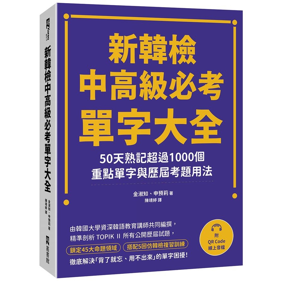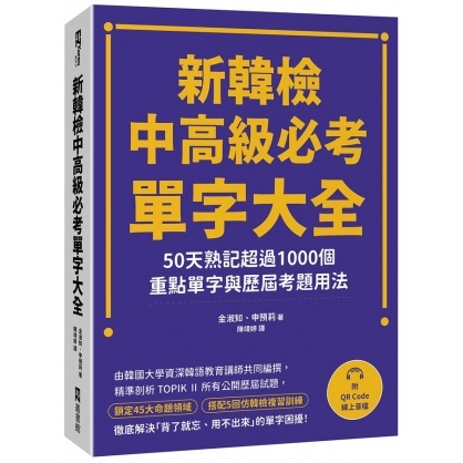 中高級單字量龐大,不知道該從哪裡開始背才最有效率?只靠硬記單字枯燥又容易忘,上考場還用不出來?想一次掌握常見相似單字與 TOPIK 最常考的實際用法?這本書,幫你一次解決所有學習單字的困擾!由韓國大學資深韓語教育講師共同編撰,精準剖析 TOPIK Ⅱ 歷屆公開試題,鎖定 45 大命題領域和 5 回仿韓檢複習,只需要 50 天,就能輕鬆活用 TOPIK 必考單字!本書特色特色一:精準鎖定 TOPIK II 必考單字,系統化主題學習!分析 2014 年韓檢改版後所有公開試題,並彙整國立國際教育院「TOPIK 公開詞彙表」及韓國國內大學與機構教材,精選出超過 1000 個必考單字,每天依照不同主題學習 30 個單字,讓你用最有效率的方式,掌握韓檢最常考的單字及其用法,不再硬記亂背。特色二:「準備-學習-確認」三階段設計,記憶更牢固!每日先透過讀韓文句子推測要學習的單字字義(準備階段),搭配例句和歷屆考題用法練習運用方式(學習階段),最後利用實戰練習題檢驗學習成果(確認階段),再加上每 10 天 1 次的複習單元,以及書末 2 回迷你模擬試題,幫助你牢牢記住並靈活運用學過的單字。特色三:出題 TIP + 高分小知識,加深單字理解!針對容易混淆的單字與相似表達方式,特別整理「出題 TIP」迅速釐清,而單字背後相關的知識背景補充,則設計「高分小知識」輔助學習,讓你邊背單字邊解決學習疑問,掌握韓檢命題方向。特色四:QR Code 線上音檔 + 全書題目中文翻譯,一本就能達成全方位學習!每日單元皆有音檔,需要聆聽音檔的地方,旁邊皆附 QR Code,搭配聆聽專業配音員朗讀書中單字與例句,背單字同時就能提升聽力與跟讀練習;附錄更收錄全書練習題的題目中譯,讓學習更全面、輕鬆又高效!*本書音檔由 EZ Course 平台(ezcourse.com.tw)提供。購書讀者須註冊會員、完成信箱認證、並完成書籍問答認證的免費訂閱程序後,即可免費收聽音檔。音檔限本人使用,請勿轉載或提供他人。