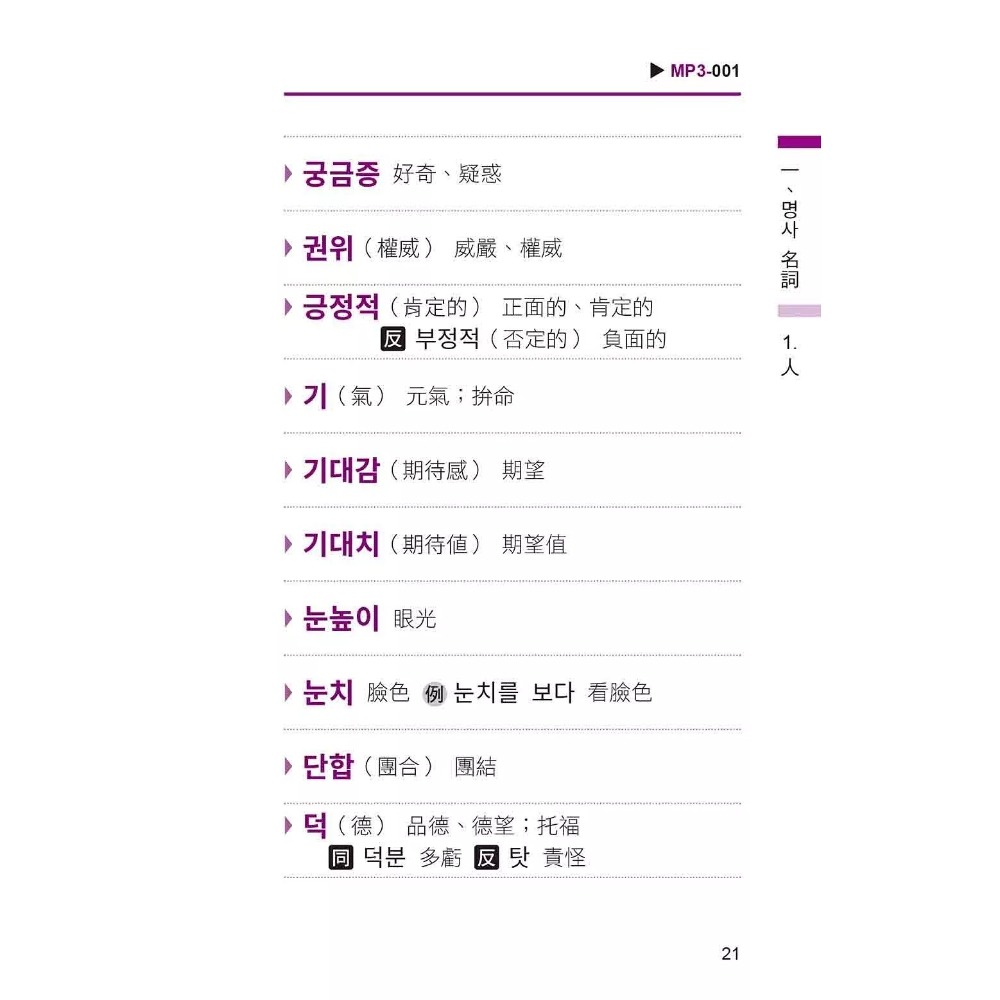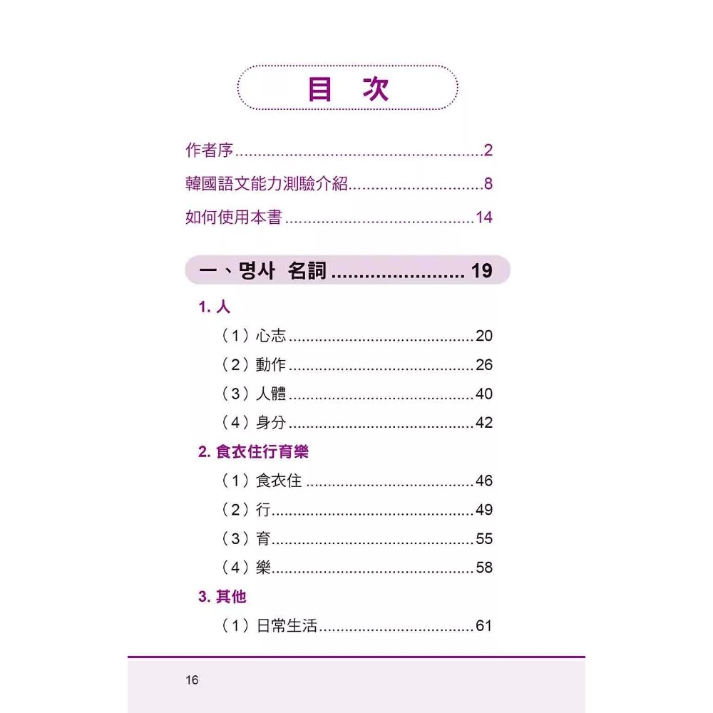 全書單字依照詞性分類,因為了解某個單字屬於何種類別,與韓語的語言體系息息相關。韓語的語序與文法皆源自於單字分類法,而《新韓檢TOPIK II 中級單字帶著背!》就是助你在「聽力‧寫作‧閱讀」科目高分過關的最佳幫手!