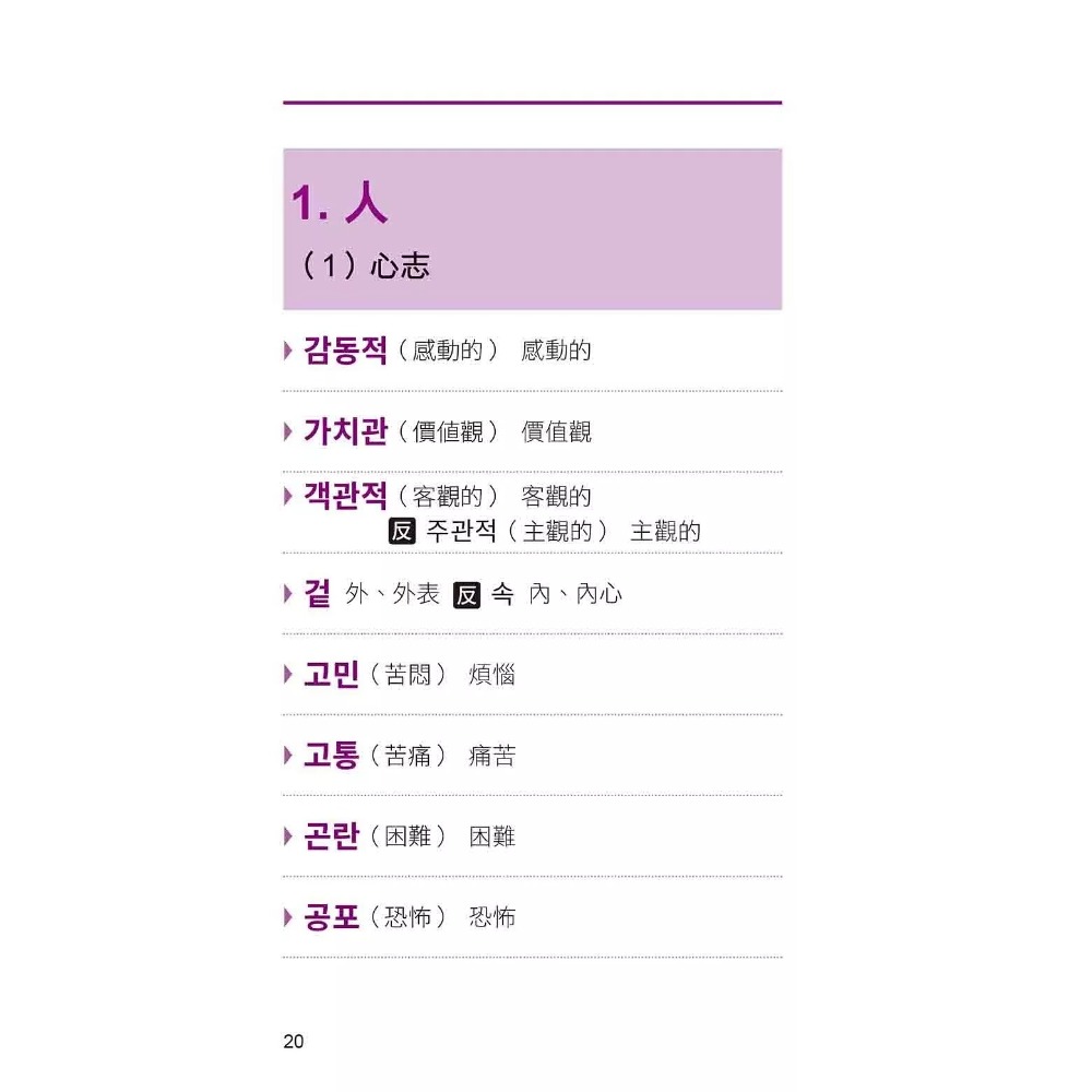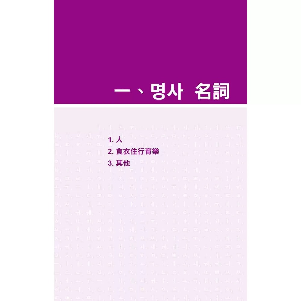 本書將所有TOPIK II 中級單字依照詞性的不同分成八大類,分別是「名詞」、「動詞」、「形容詞」、「副詞」、「助詞」、「冠形詞」、「感嘆詞」、「外來語」。接著再在各大類下細分各個小項目,例如「名詞」下可分為:「人」、「食衣住行育樂」、「其他」等,群組記憶單字,好記不遺漏!