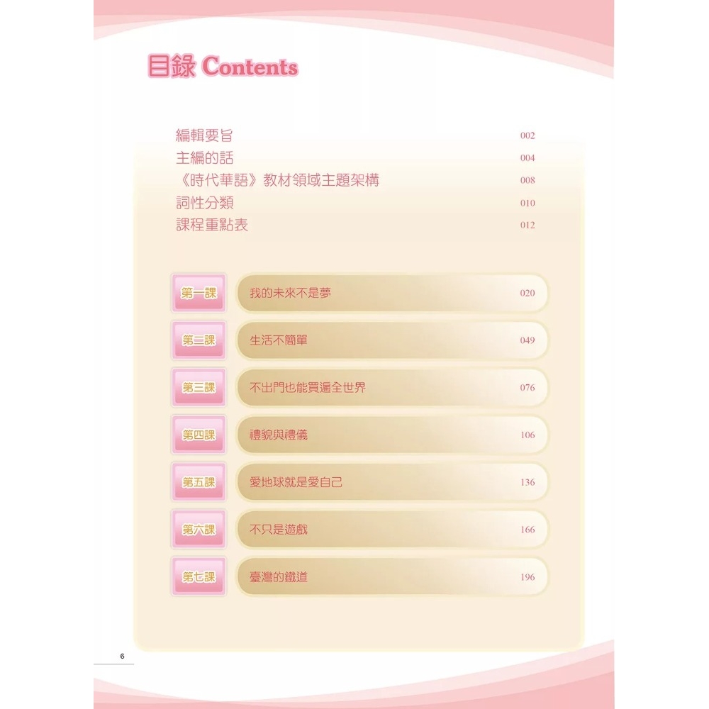 本教材參考美國 ACTFL(外語教師協會)所提出的 5C 指標(溝通、貫連、文化、比較、社區)、4 項語言技能(聽、說、讀、寫)以及 3 項溝通模式(互動溝通、理解詮釋、表達演示)為主來編寫。透過詞彙與語法的安排、各項教學設計與練習的指導,充分展現於各冊的 16 個主題領域中。每冊教材所包括的內容大致如下:1.課文(本冊前八課為對話,後八課為短文);2.生詞及用法;3.語法點說明、舉例及練習;4.短文;5.課室活動;6.注釋。